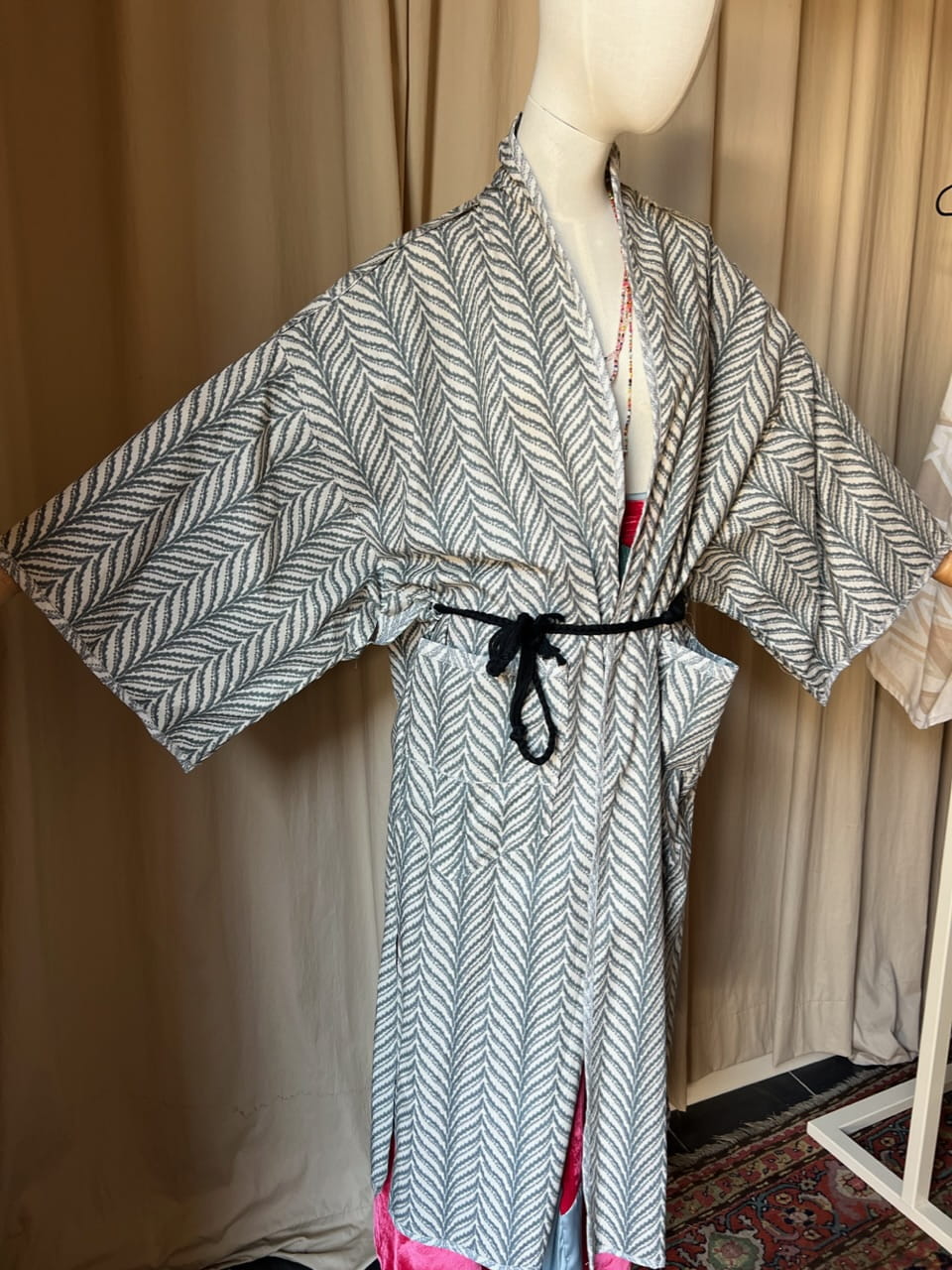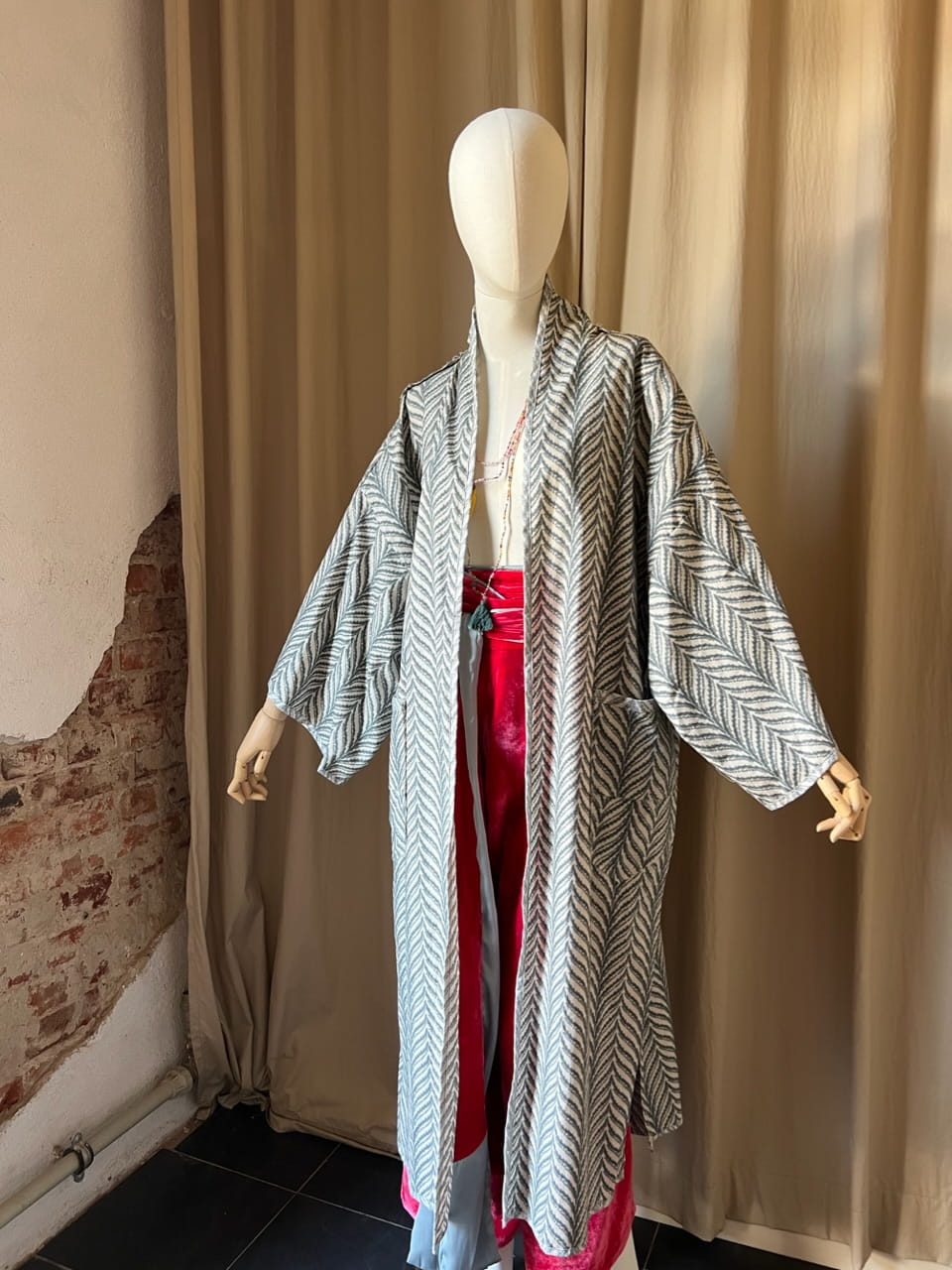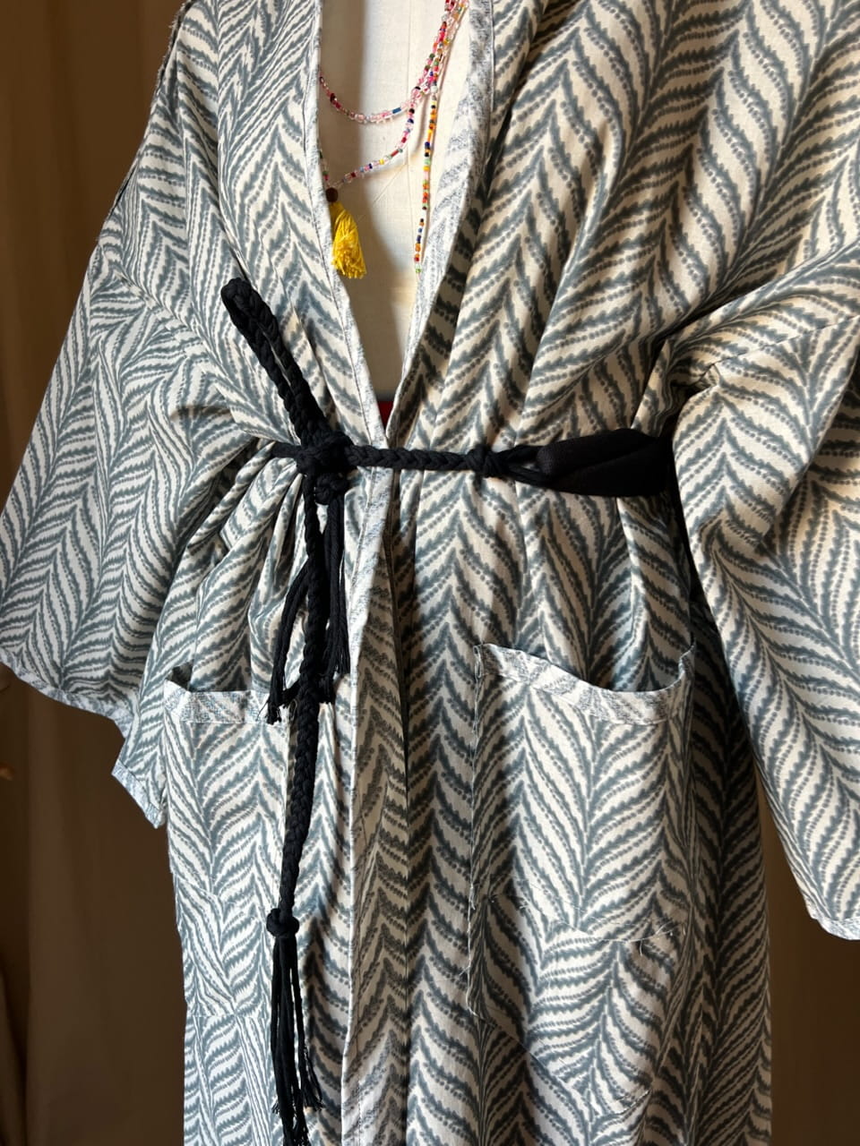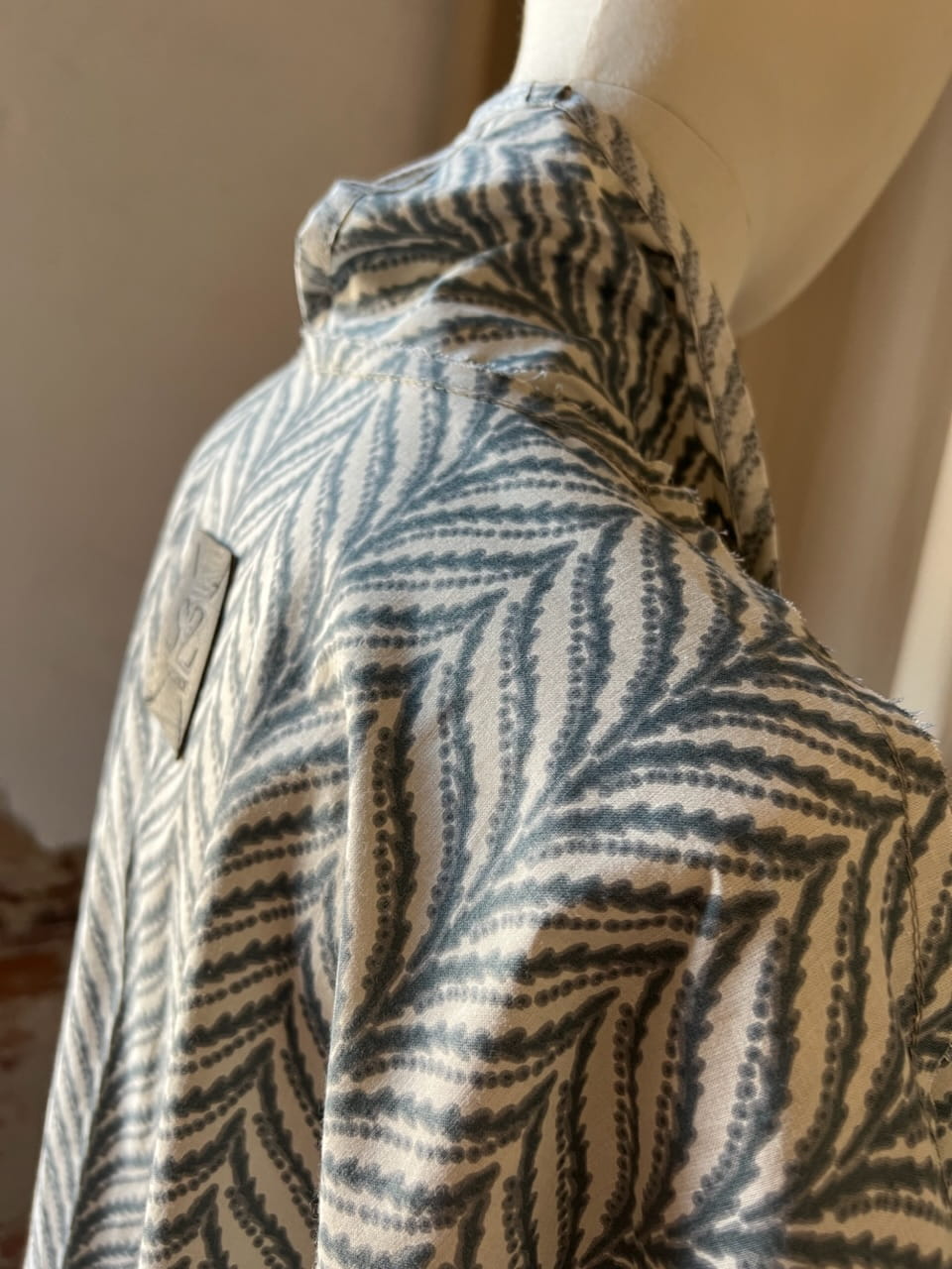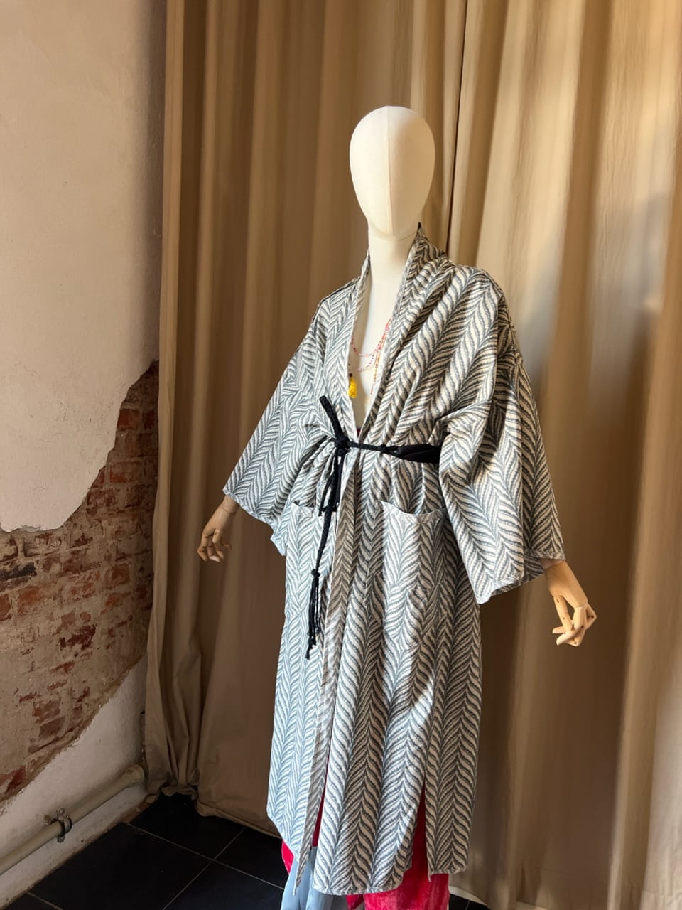 Kimono z cienkiej bawełny drukowanej. W odcieniach beżu i niebieskości. Kieszenie, szyte szwami francuskimi, pęknięcia w rękawach. Do przewiązania wyplatany czarny pasek. Forma oversize.
