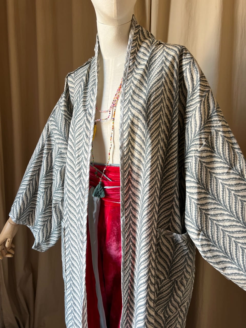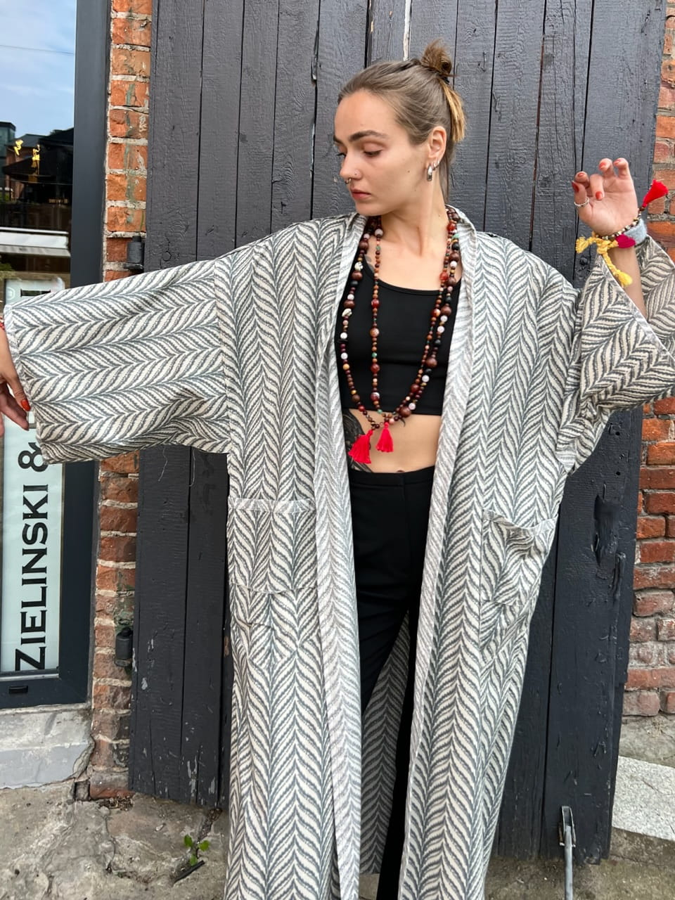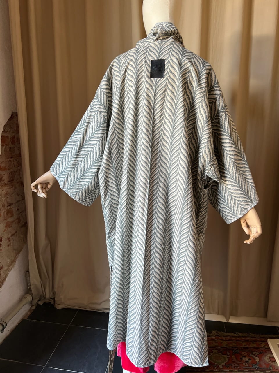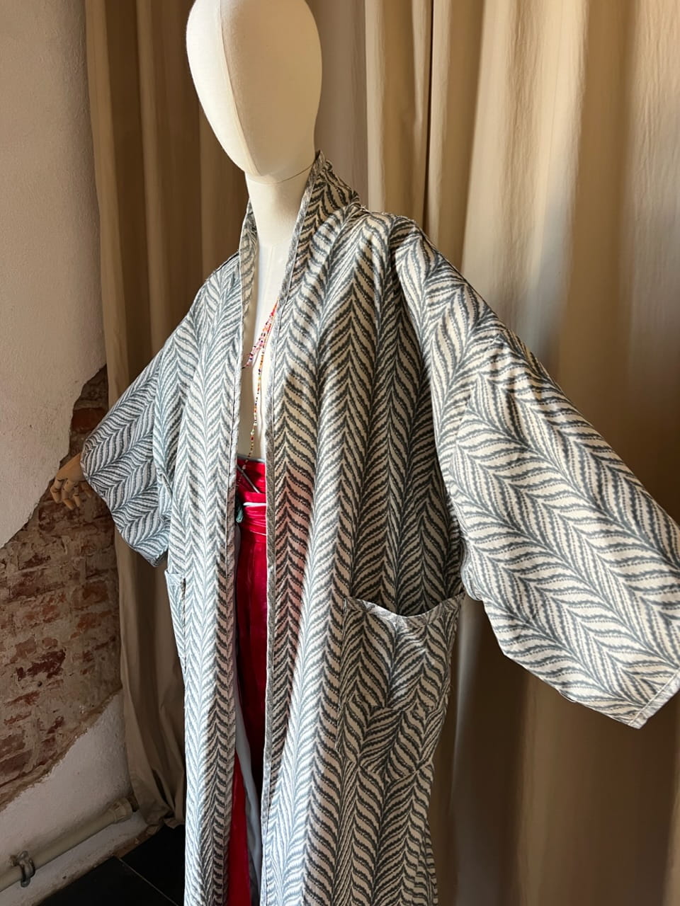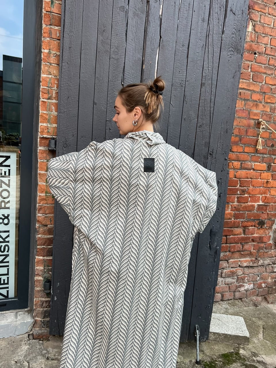 Kimono z cienkiej bawełny drukowanej. W odcieniach beżu i niebieskości. Kieszenie, szyte szwami francuskimi, pęknięcia w rękawach. Do przewiązania wyplatany czarny pasek. Forma oversize.