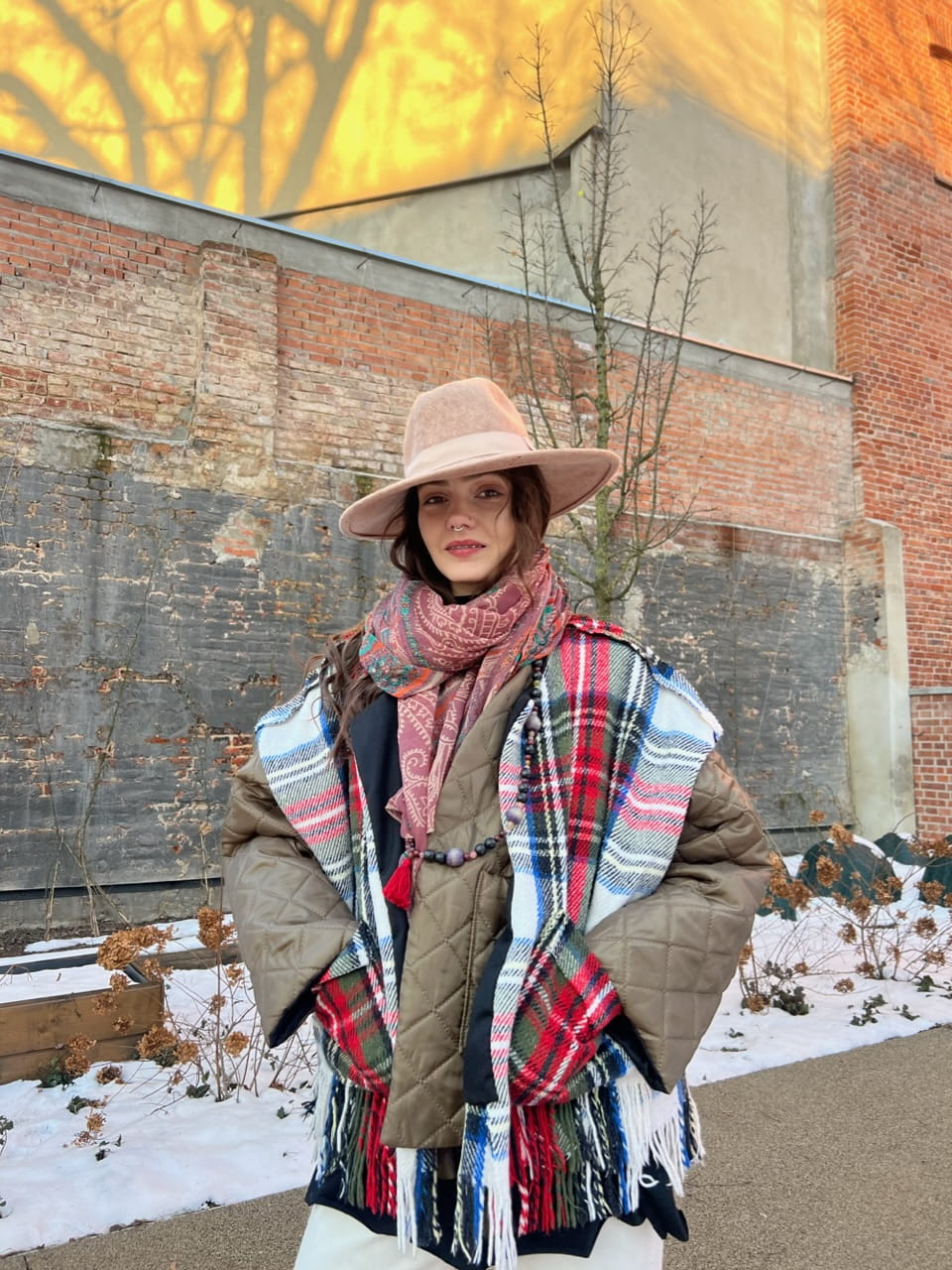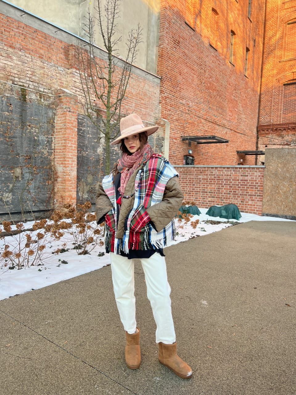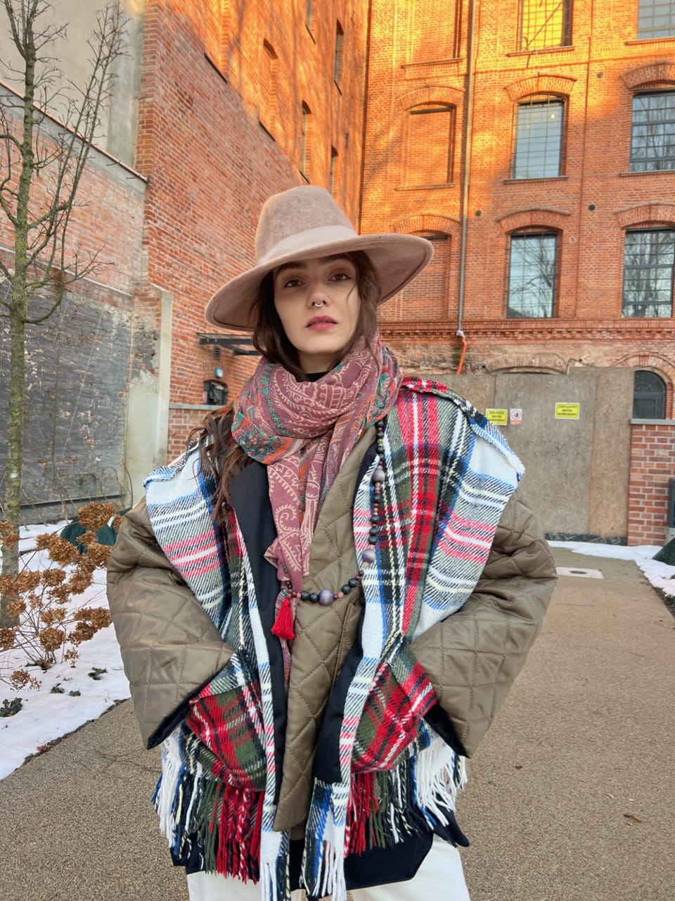 Kamizelka, nowe życie wełnianego koca. Kieszenie, czarna bawełniana podszewka. Z tyłu czarne logo PtASZEK. Jeden jedyny projekt upcyclingowy. Szeroka forma pudełka.
