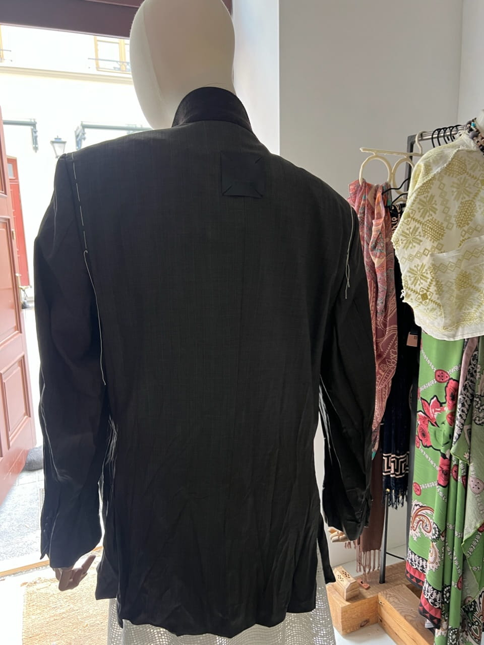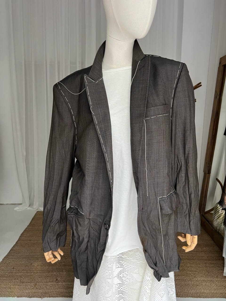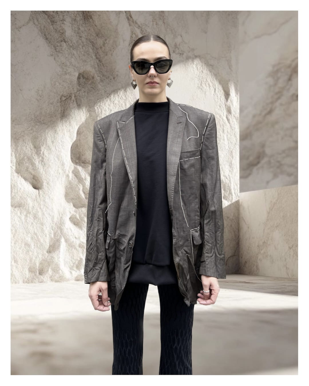 Marynarka męska, sprana, gnieciona. Obszyta nicią krawiecką. Z tyłu logo PtASZEK. Jeden jedyny projekt upcyclingowy.