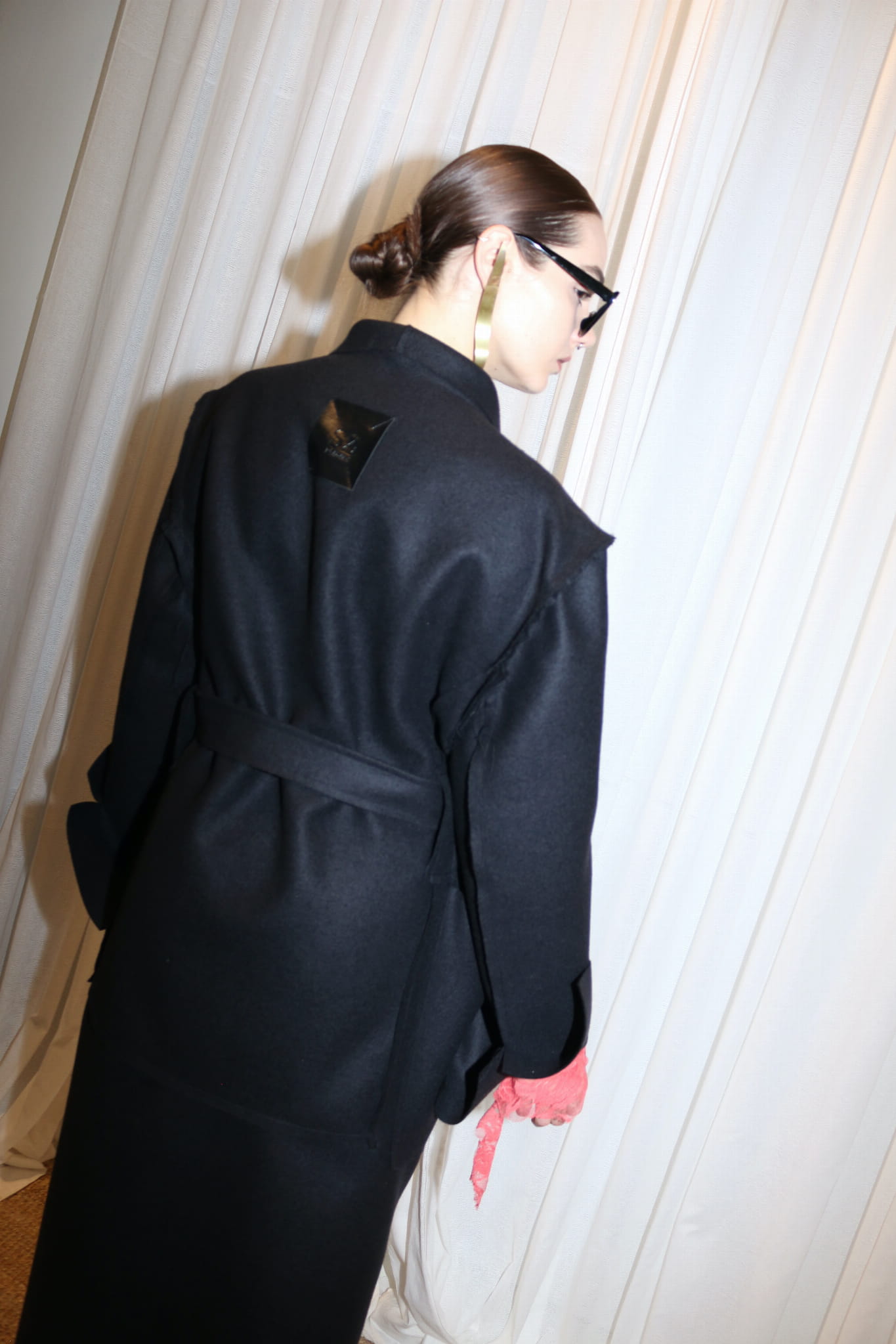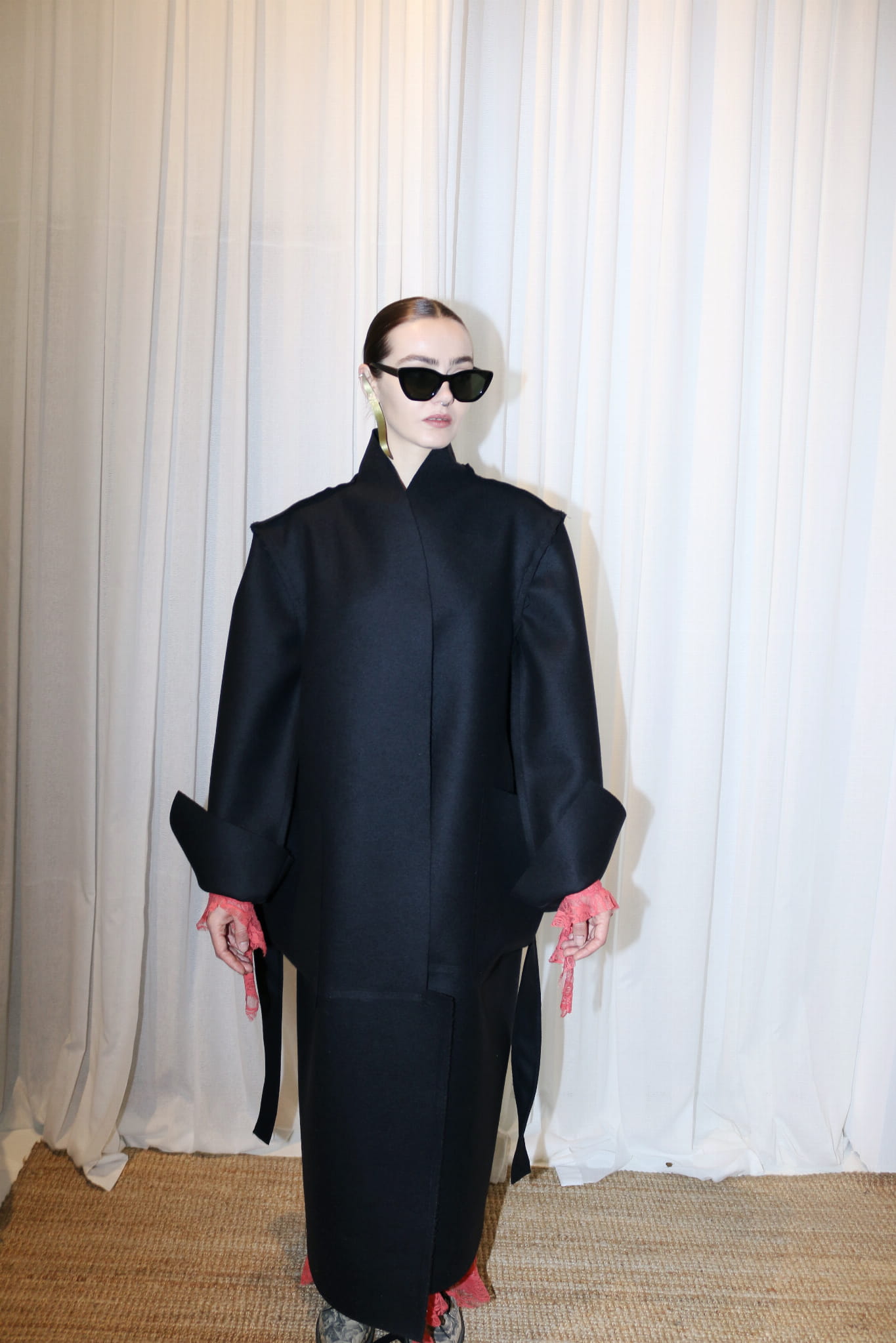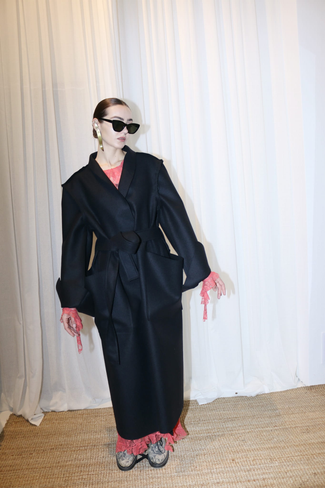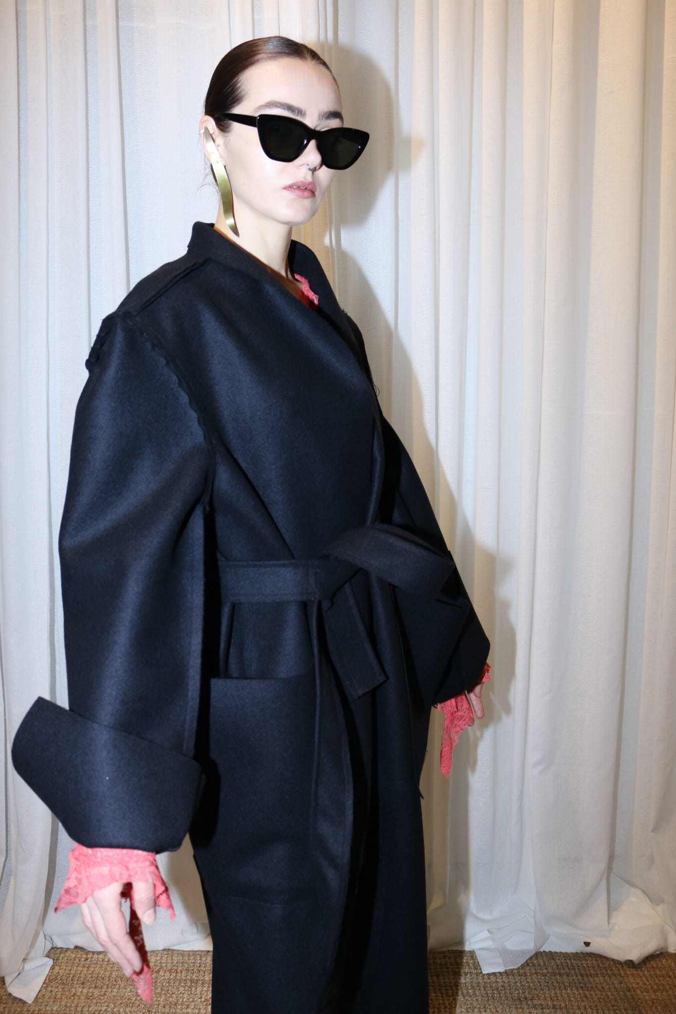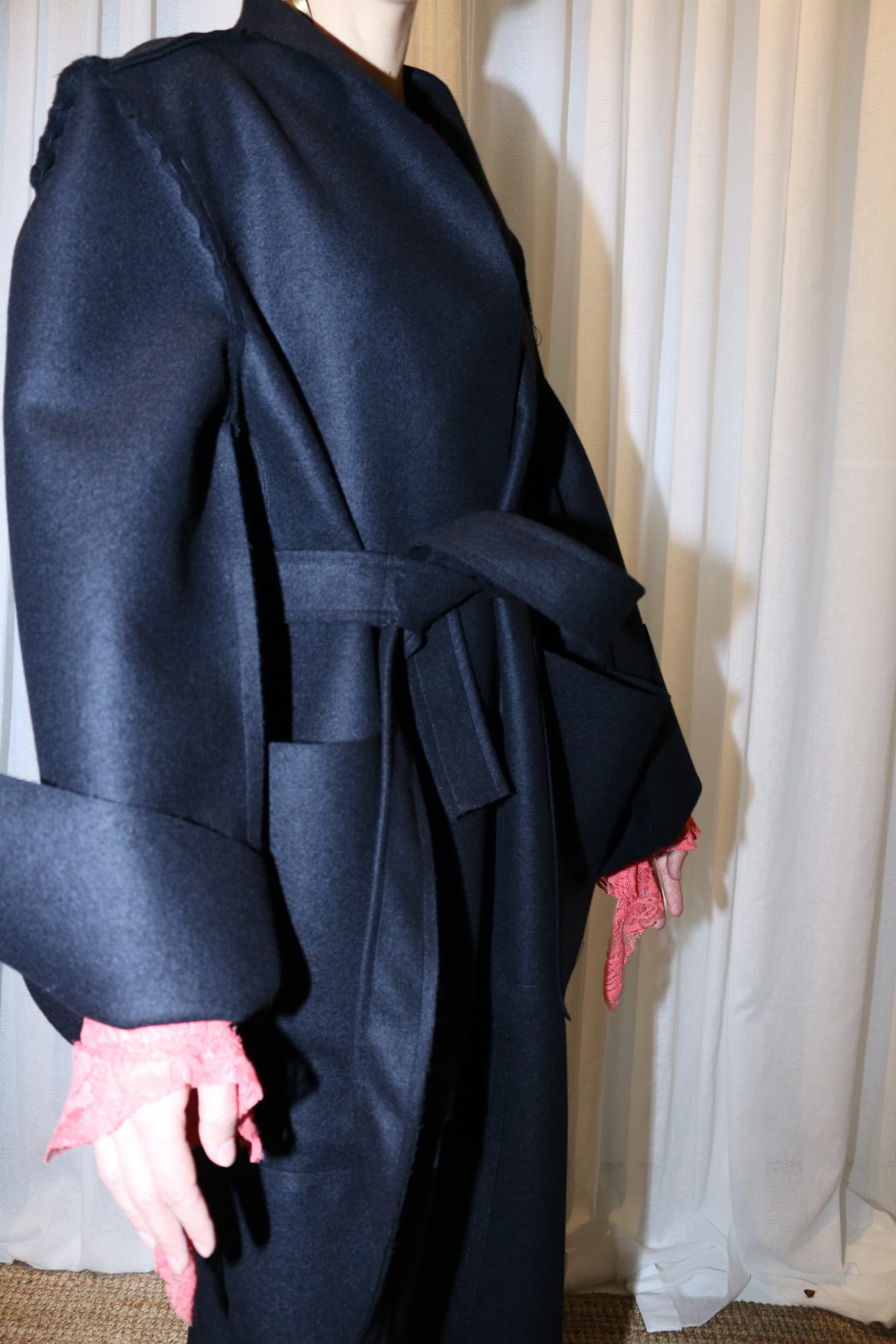 Płaszcz z czarnego/ciemno grafitowego sukna/ 100% wełna / surowe wykończenia, szalowy kołnierz, dwie kieszenie, pasek do przewiązania. Długie rękawy z pęknięciami.