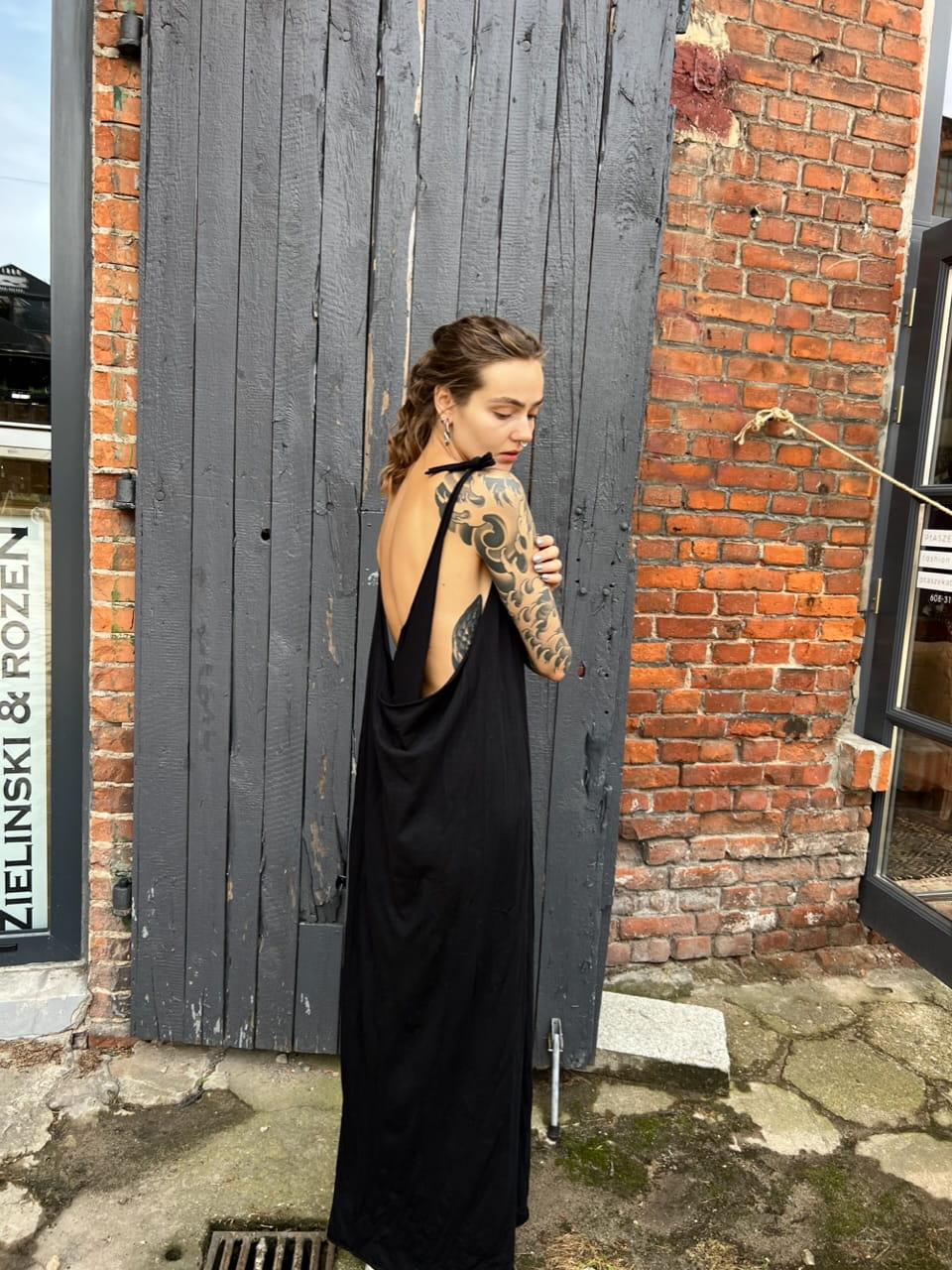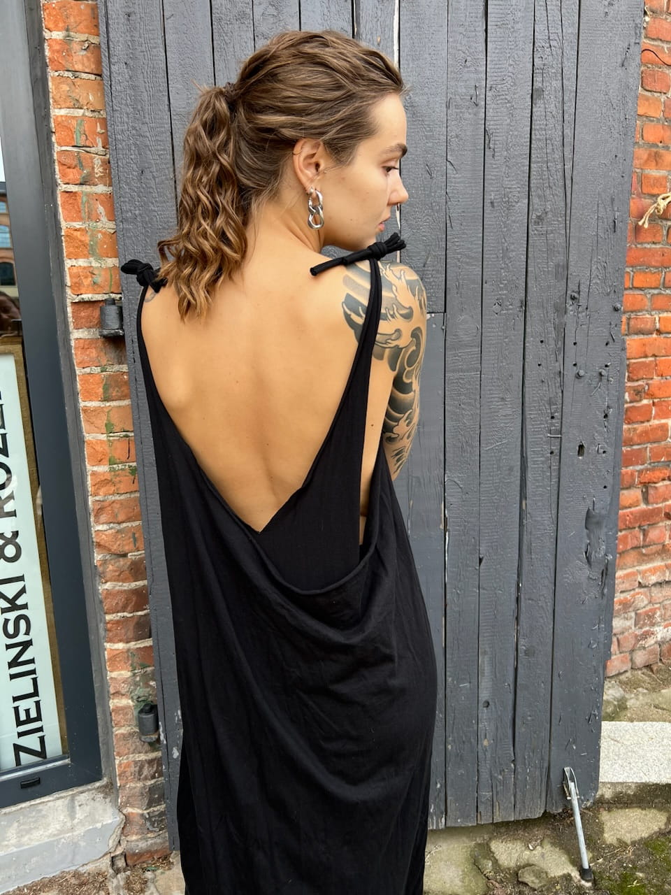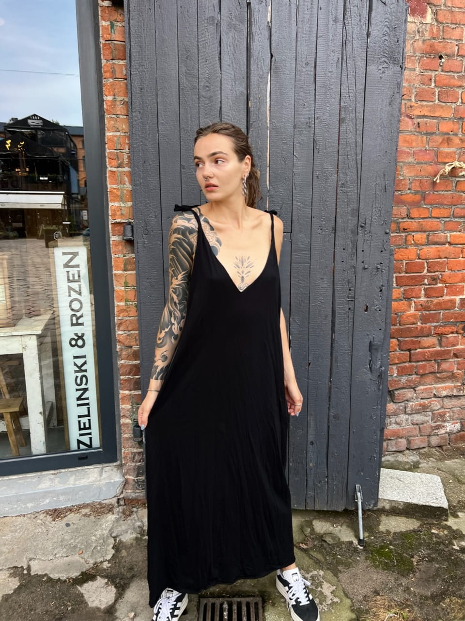 Długa sukienka z dzianiny w kolorze czarnym. Luźna forma oversize, zawiązywane ramiączka, możliwość regulacji. Dzianina z surowym wykończeniem. Prosta firma sukienki która powstała na Festiwal Wibracje