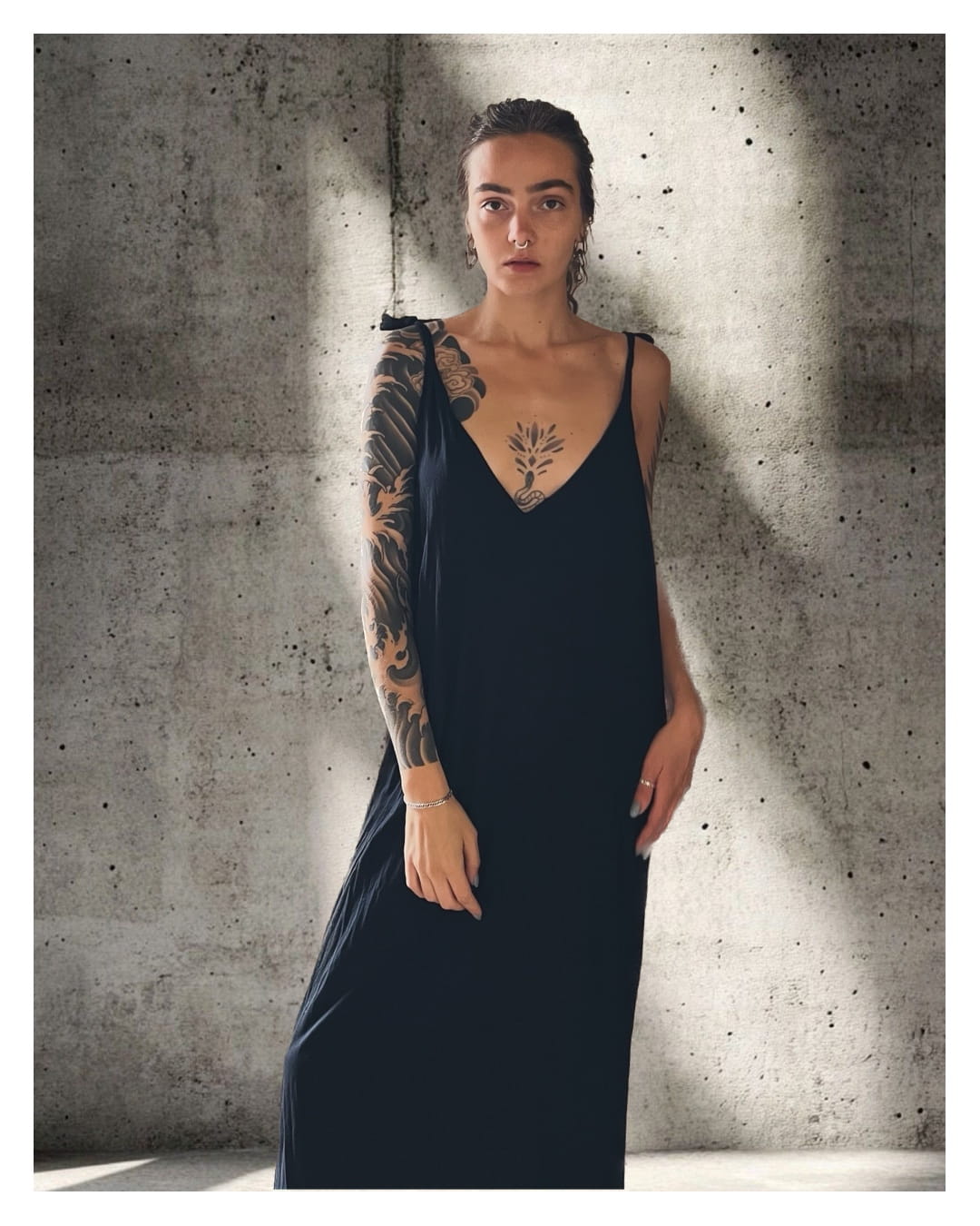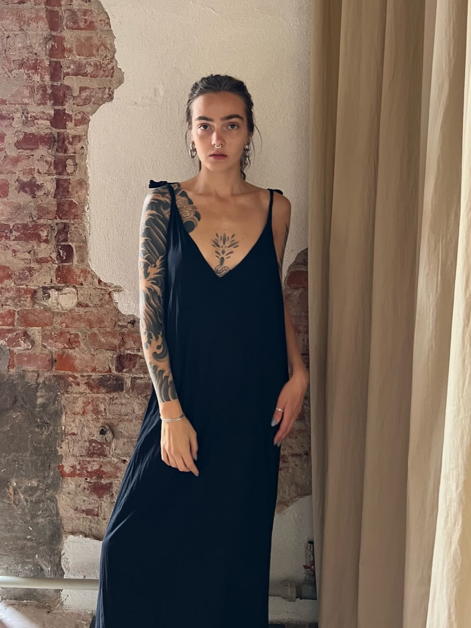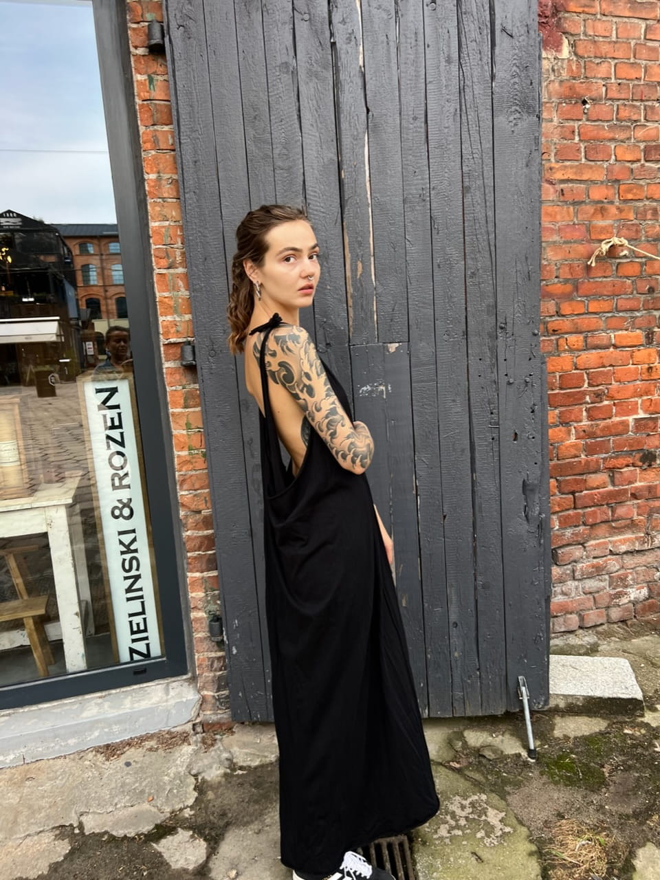 Długa sukienka z dzianiny w kolorze czarnym. Luźna forma oversize, zawiązywane ramiączka, możliwość regulacji. Dzianina z surowym wykończeniem. Prosta firma sukienki która powstała na Festiwal Wibracje