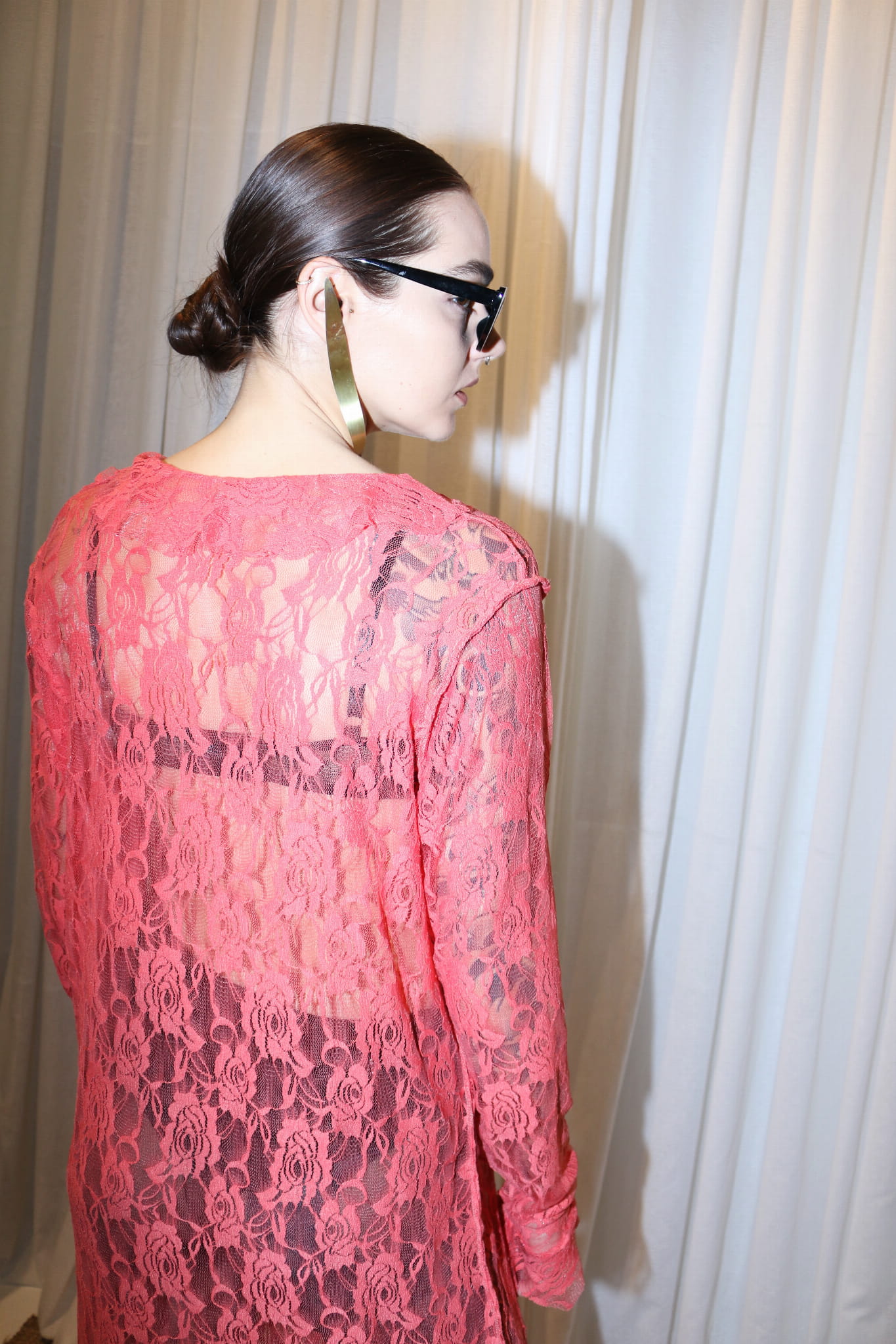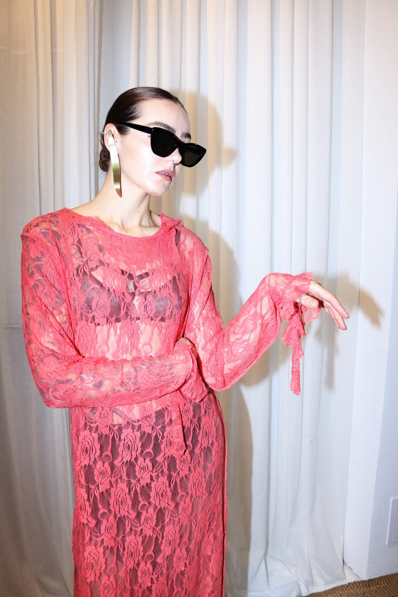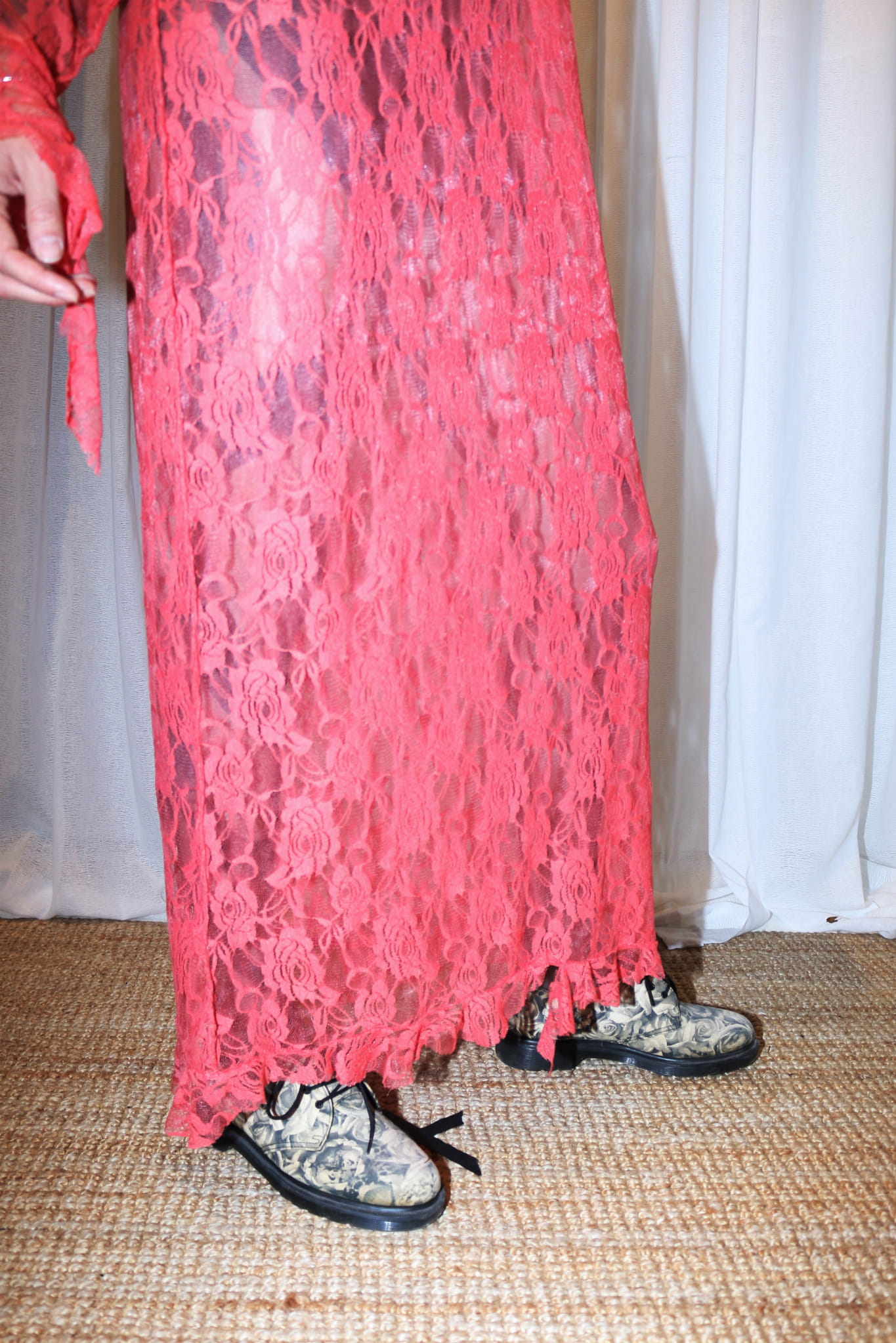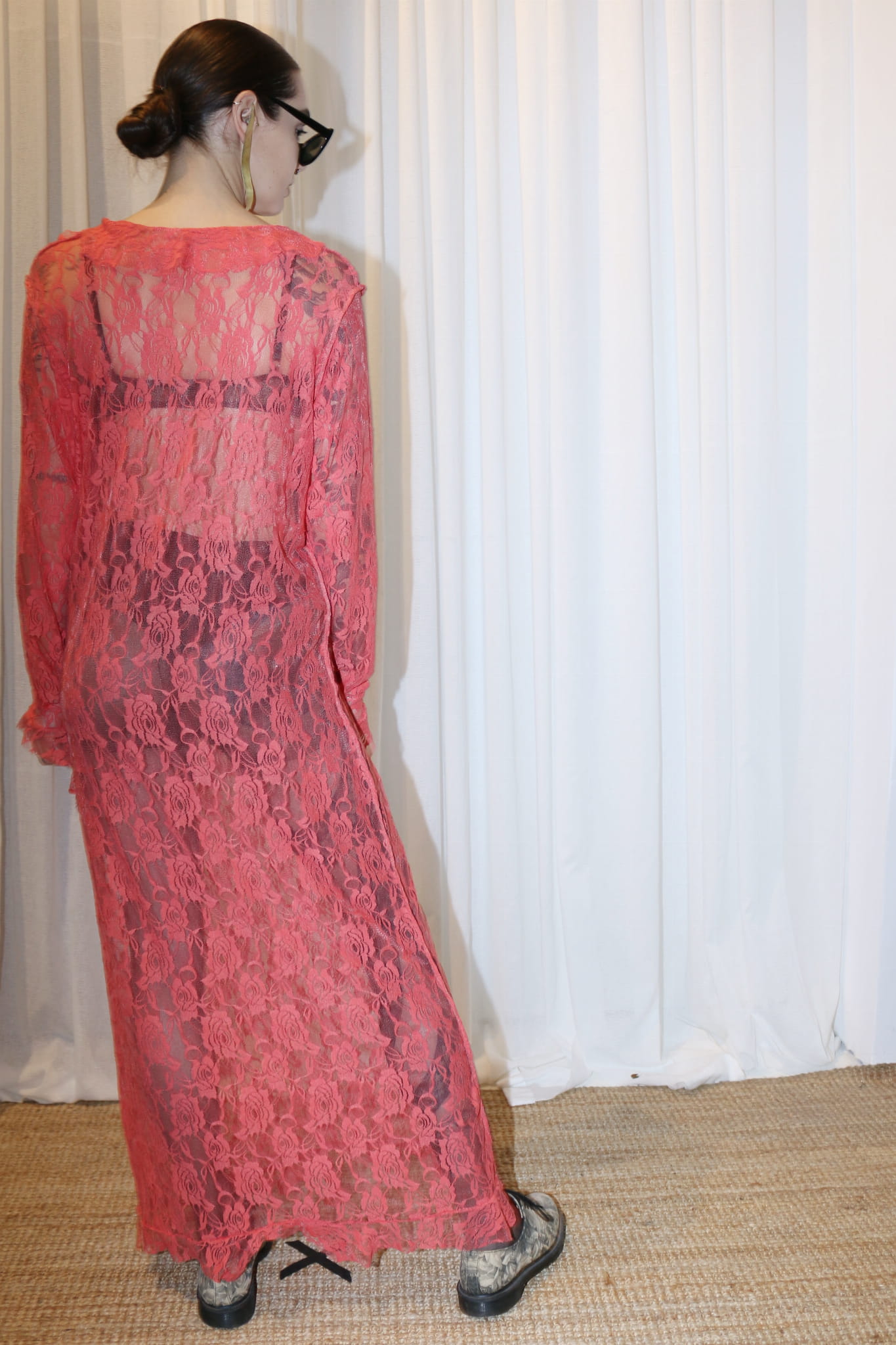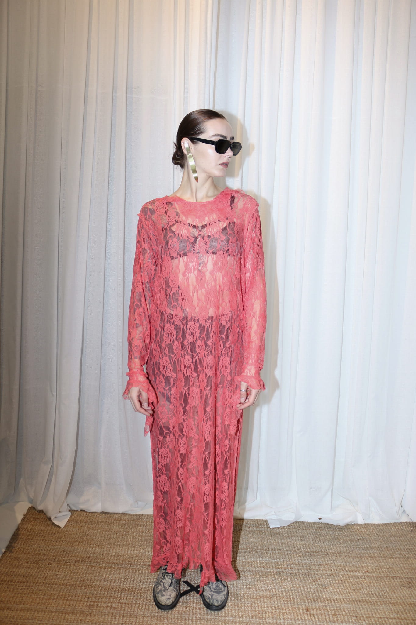 Sukienka z pięknej koralowej koronki w róże. Długa prosta forma, dół, rękawy i dekolt wykończone falbaną z tej samej koronki.