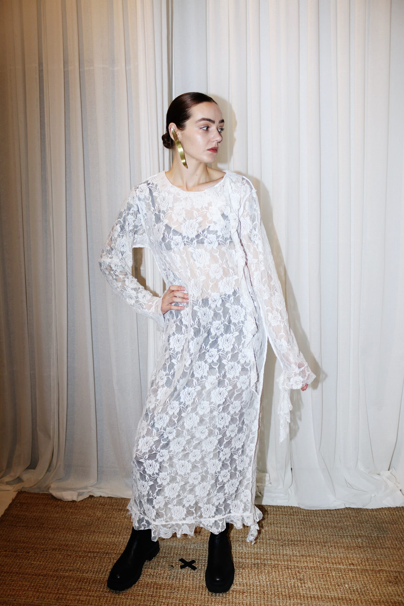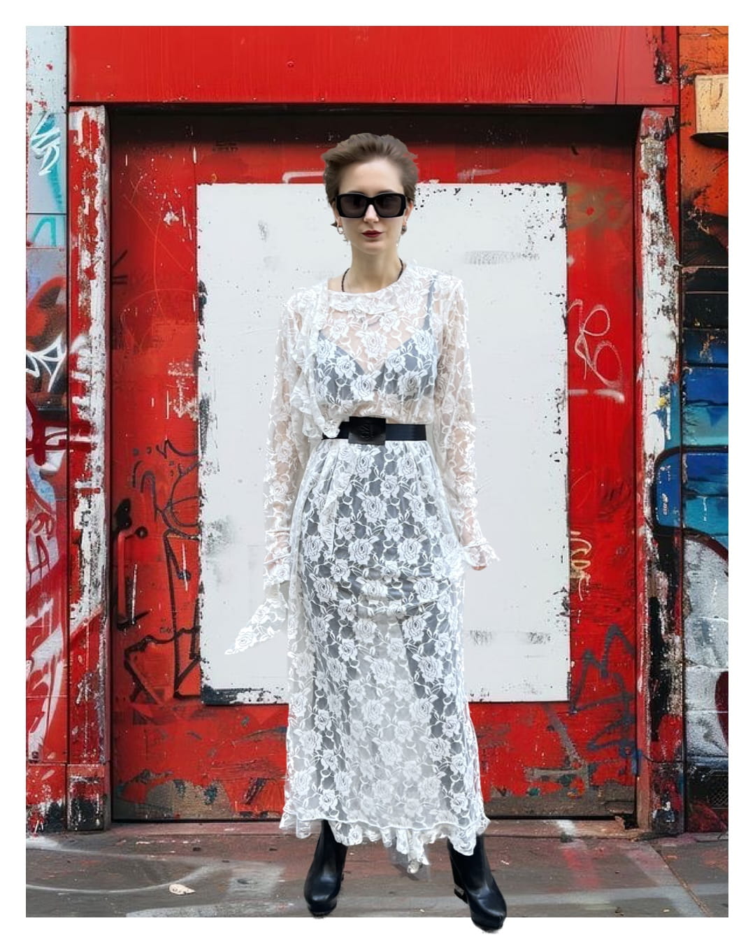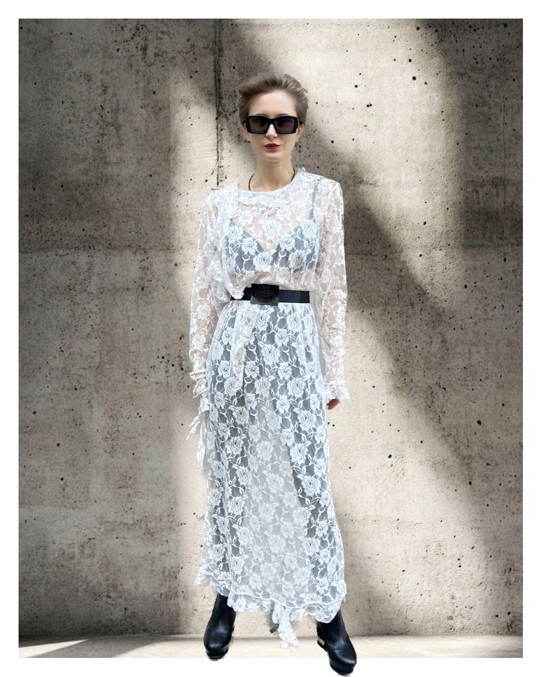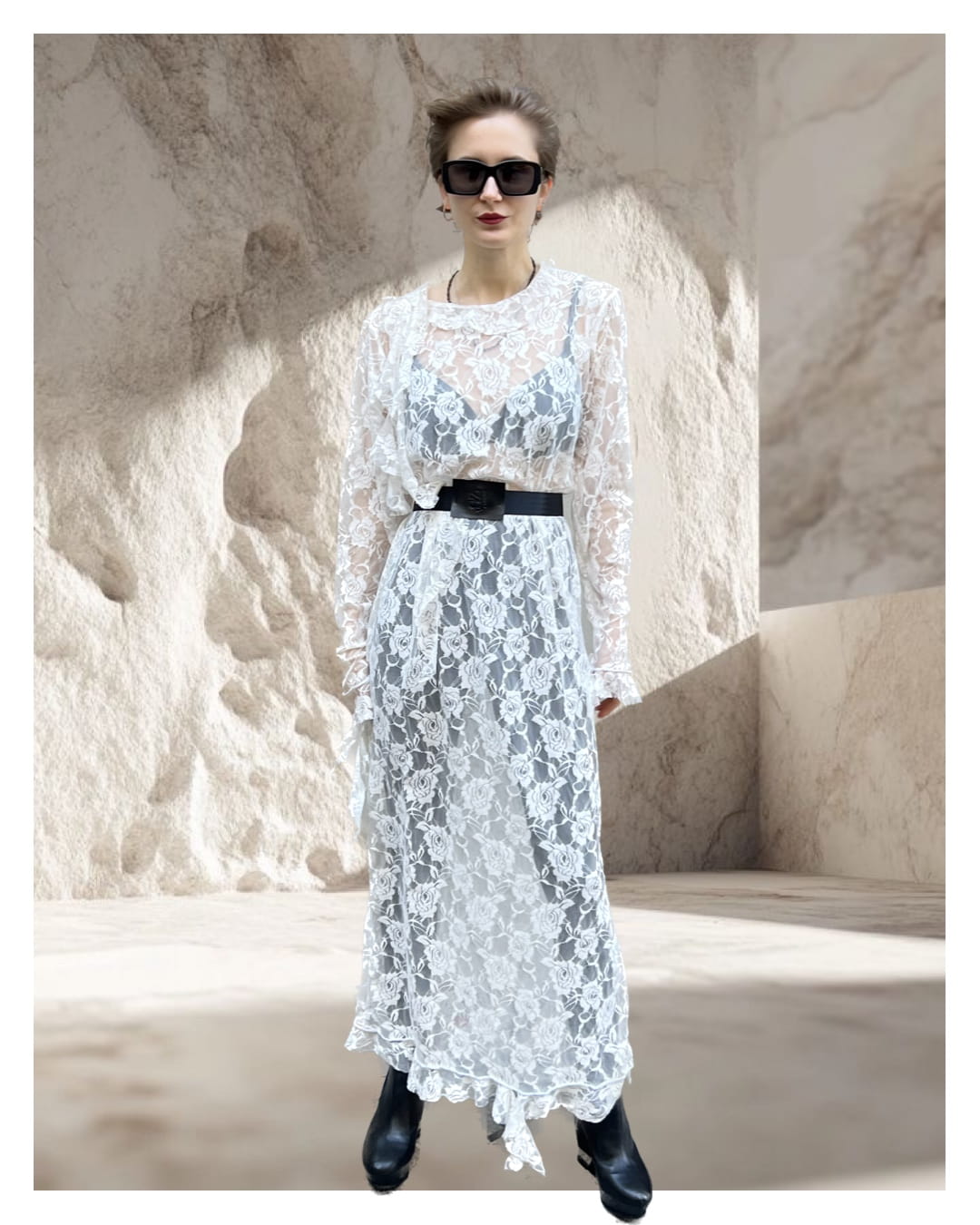 Sukienka z pięknej biało/kremowej koronki w róże. Długa prosta forma, dół, rękawy i dekolt wykończone falbaną z tej samej koronki.