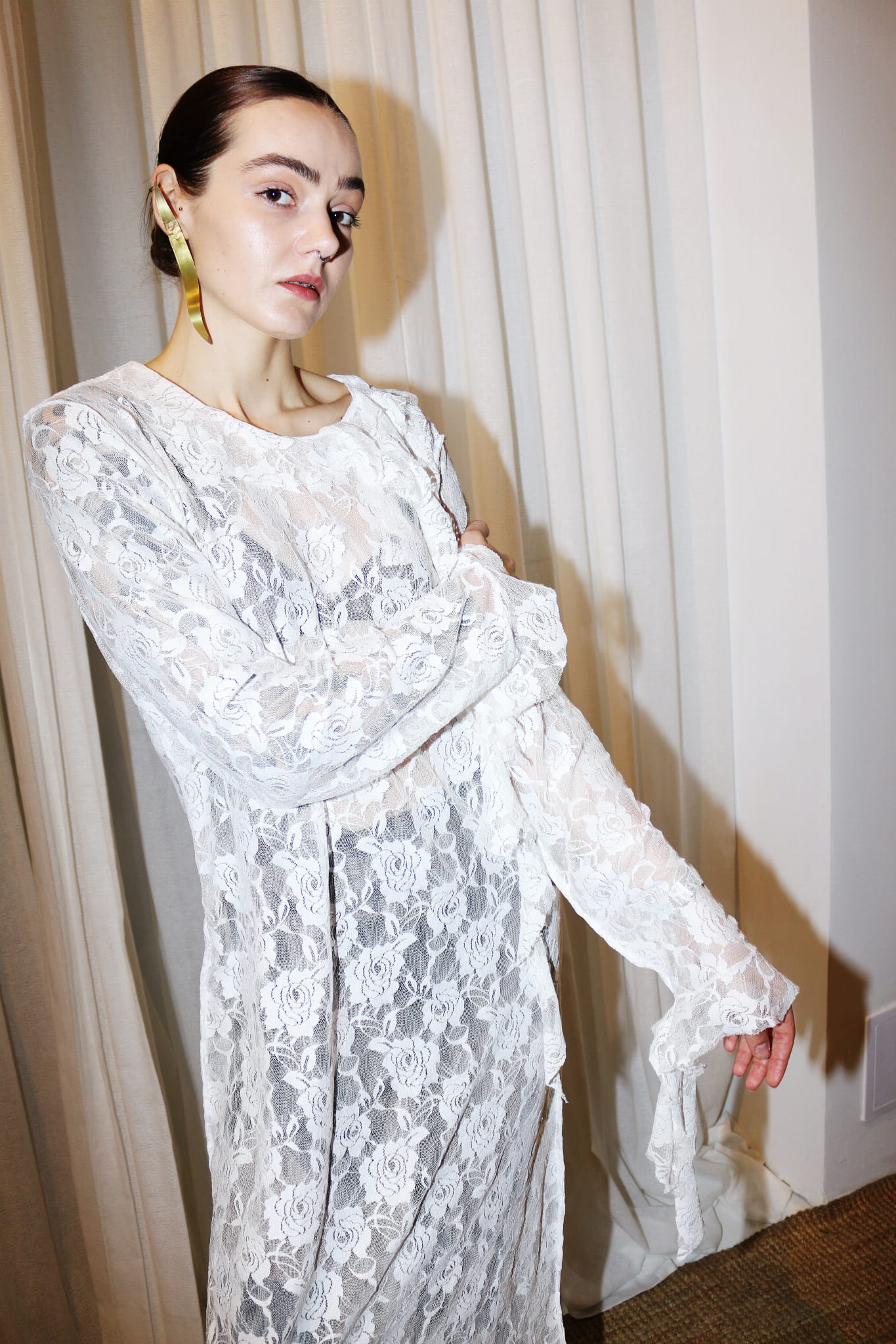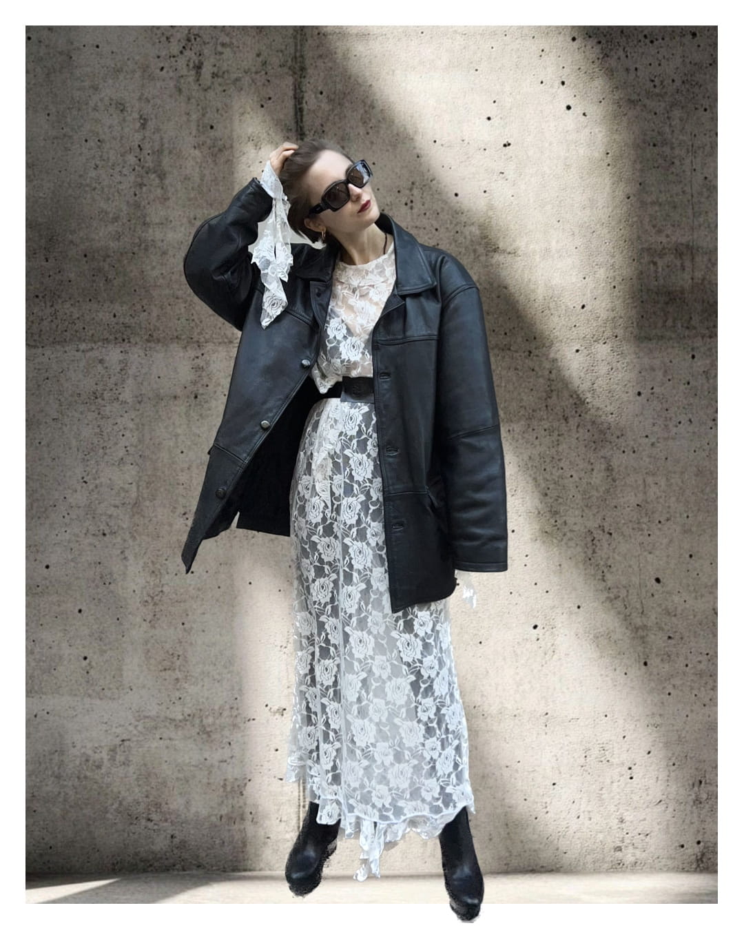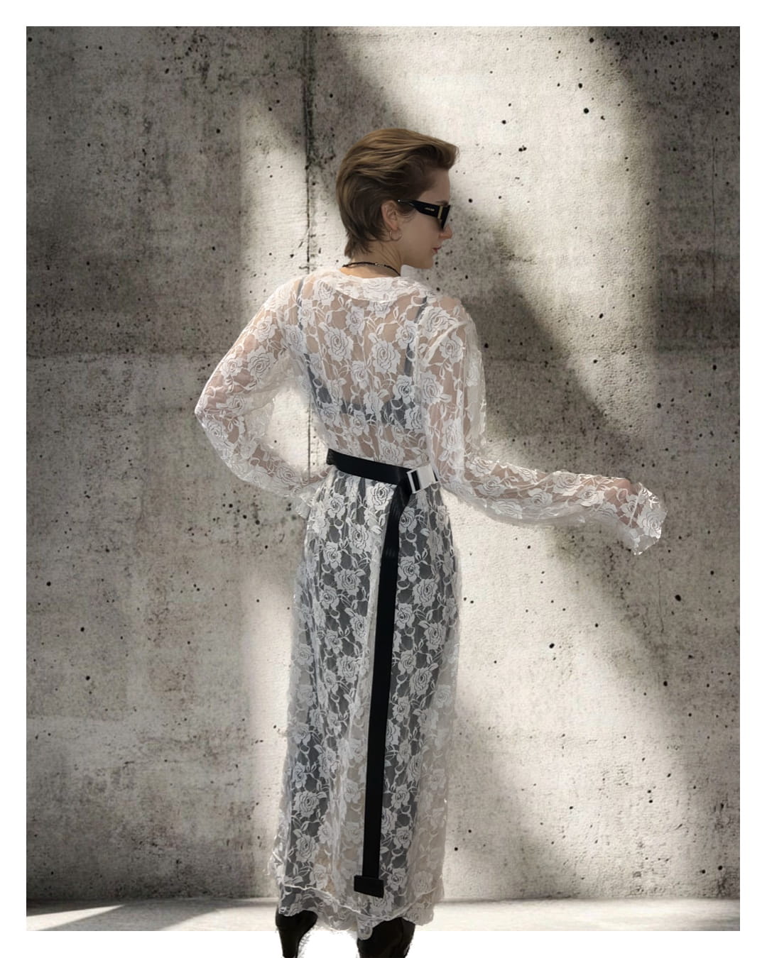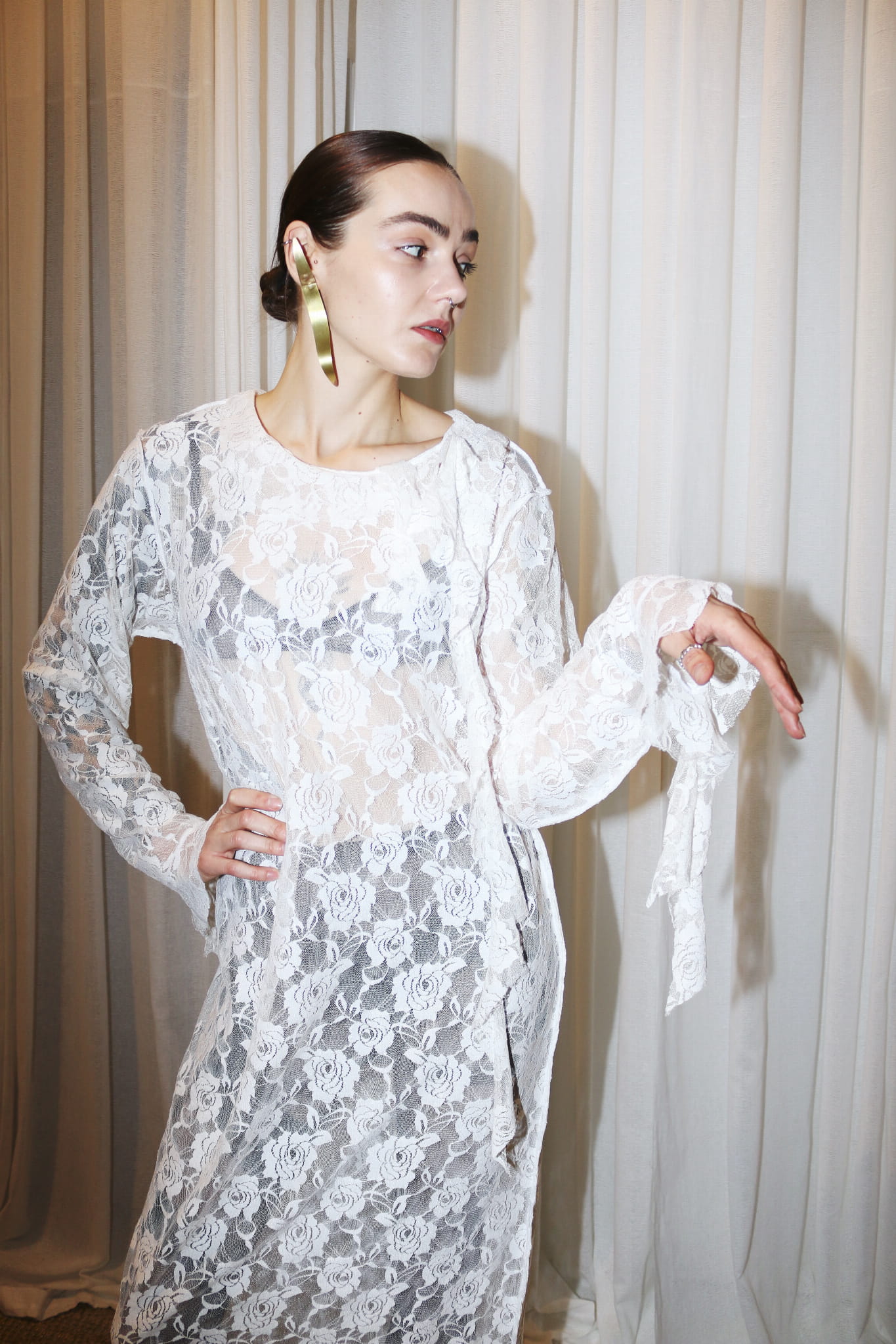 Sukienka z pięknej biało/kremowej koronki w róże. Długa prosta forma, dół, rękawy i dekolt wykończone falbaną z tej samej koronki.