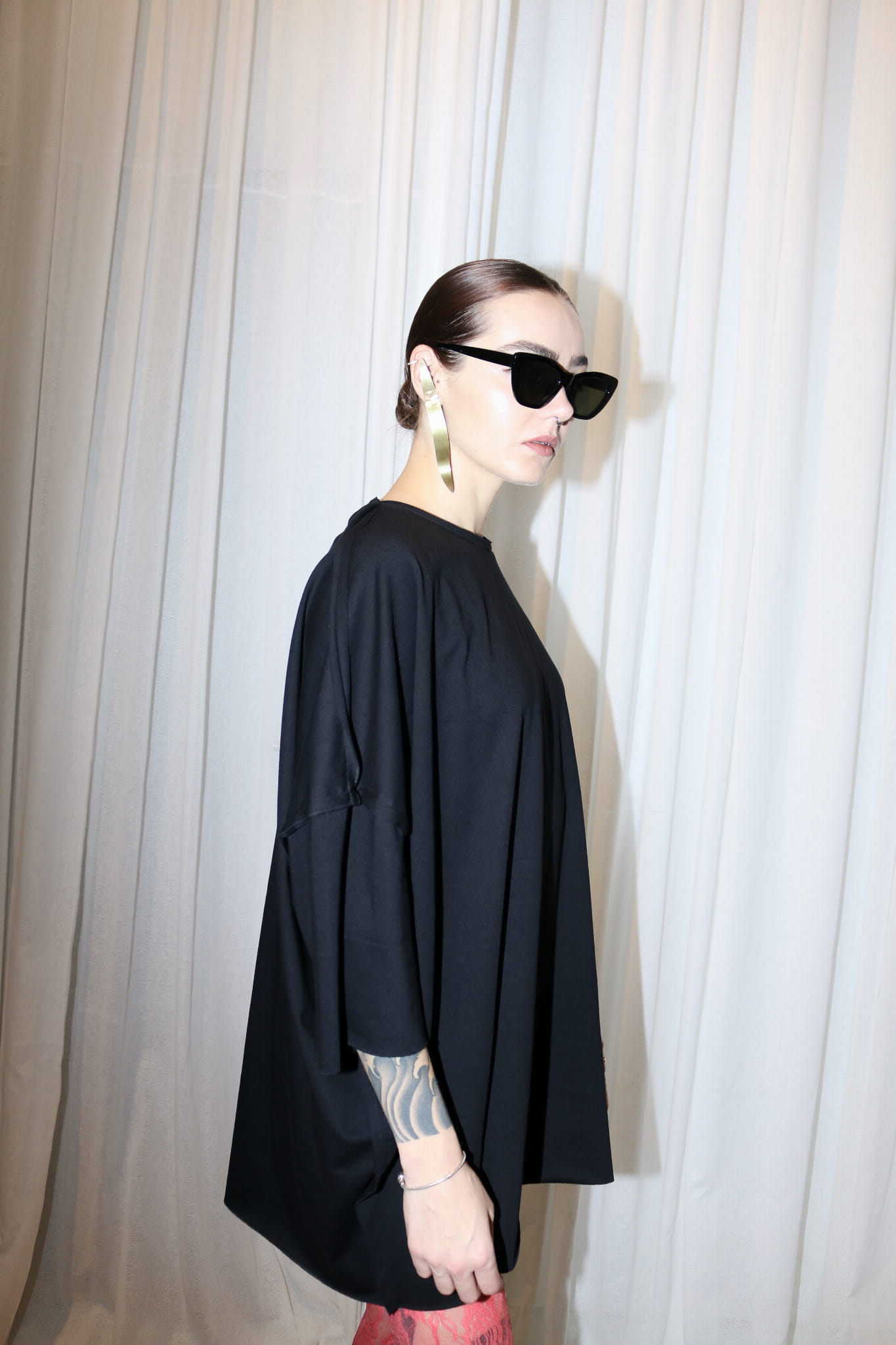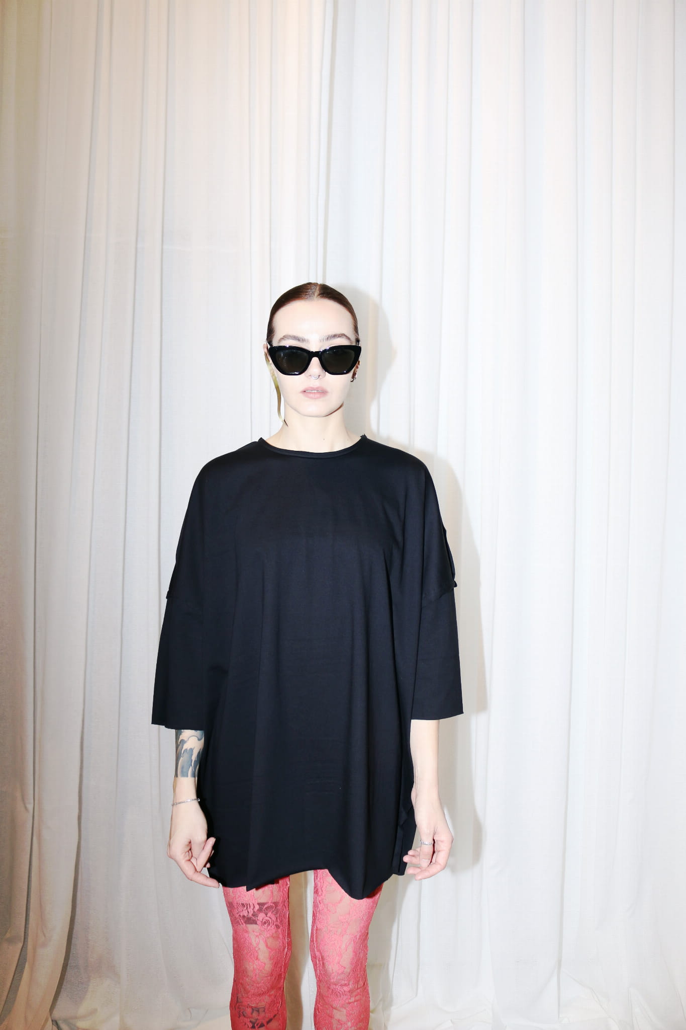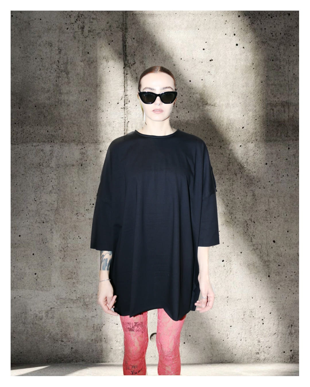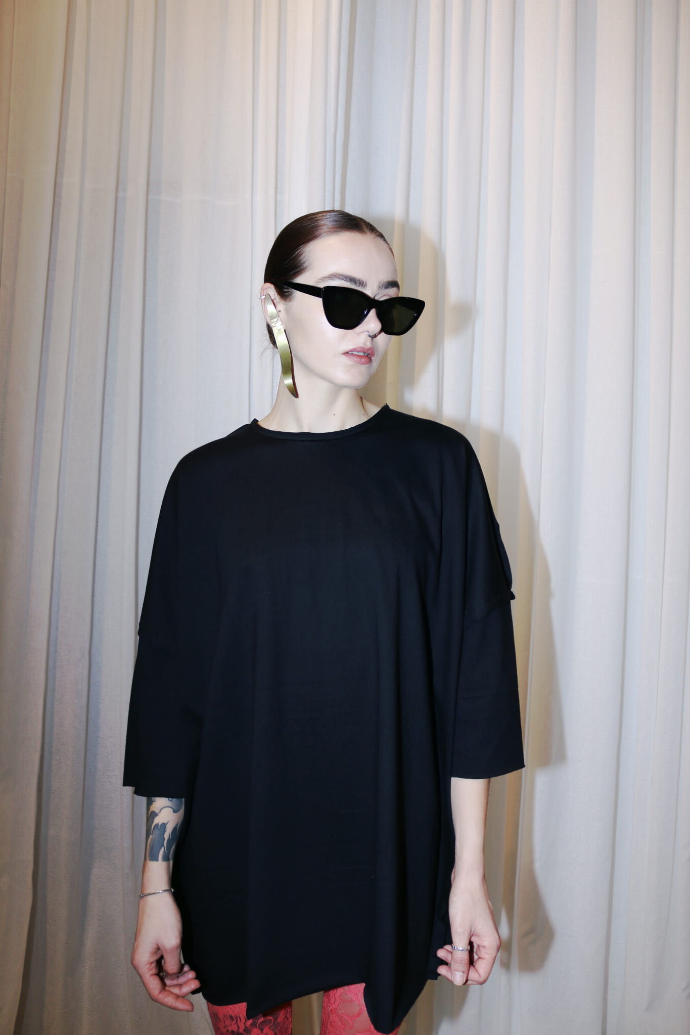 T-shirt z dekoltem pod szyję, surowa forma oversize. Czarne logo PtASZEK z tyłu. Dostępny w kolorach czarny i biały.