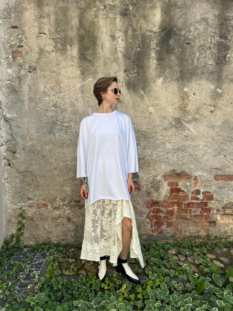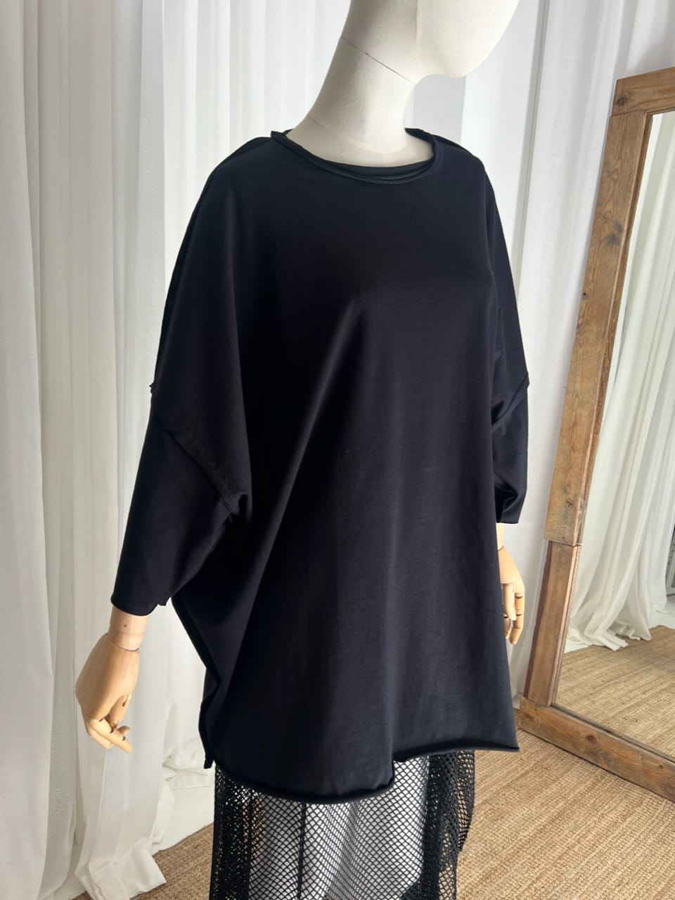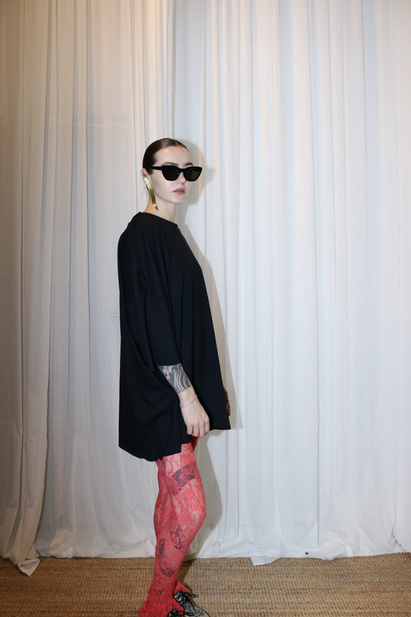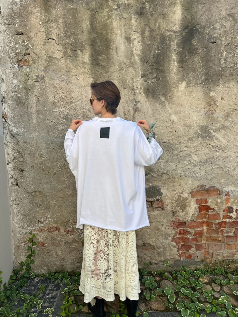 T-shirt z dekoltem pod szyję, surowa forma oversize. Czarne logo PtASZEK z tyłu. Dostępny w kolorach czarny i biały.
