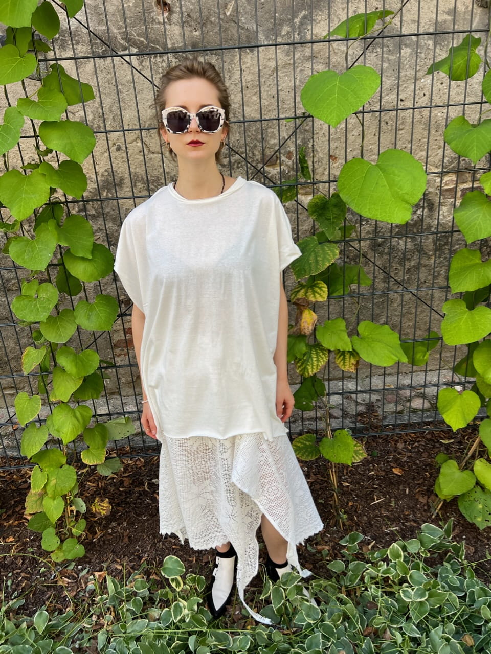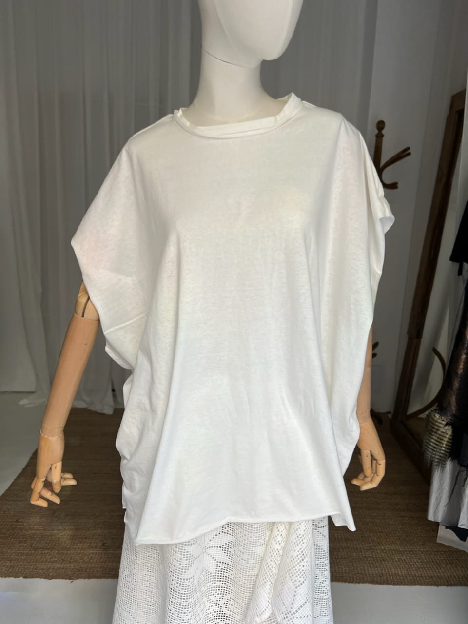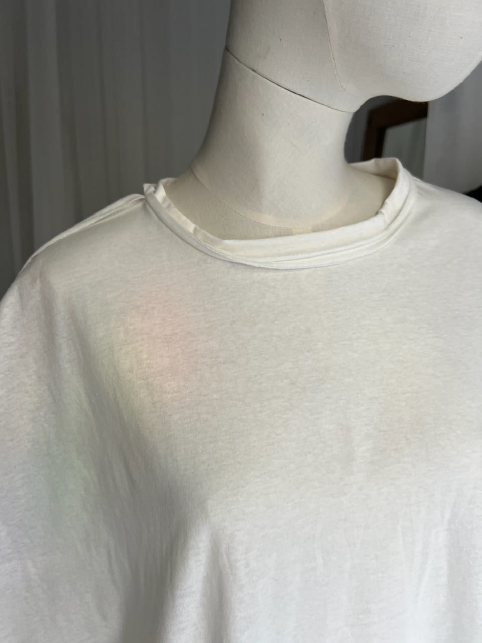 T-shirt Boxy z dzianiny kremowej, 150 gram, wyprodukowana w Łodzi. Prosta forma oversize z podwiniętymi ramionami.