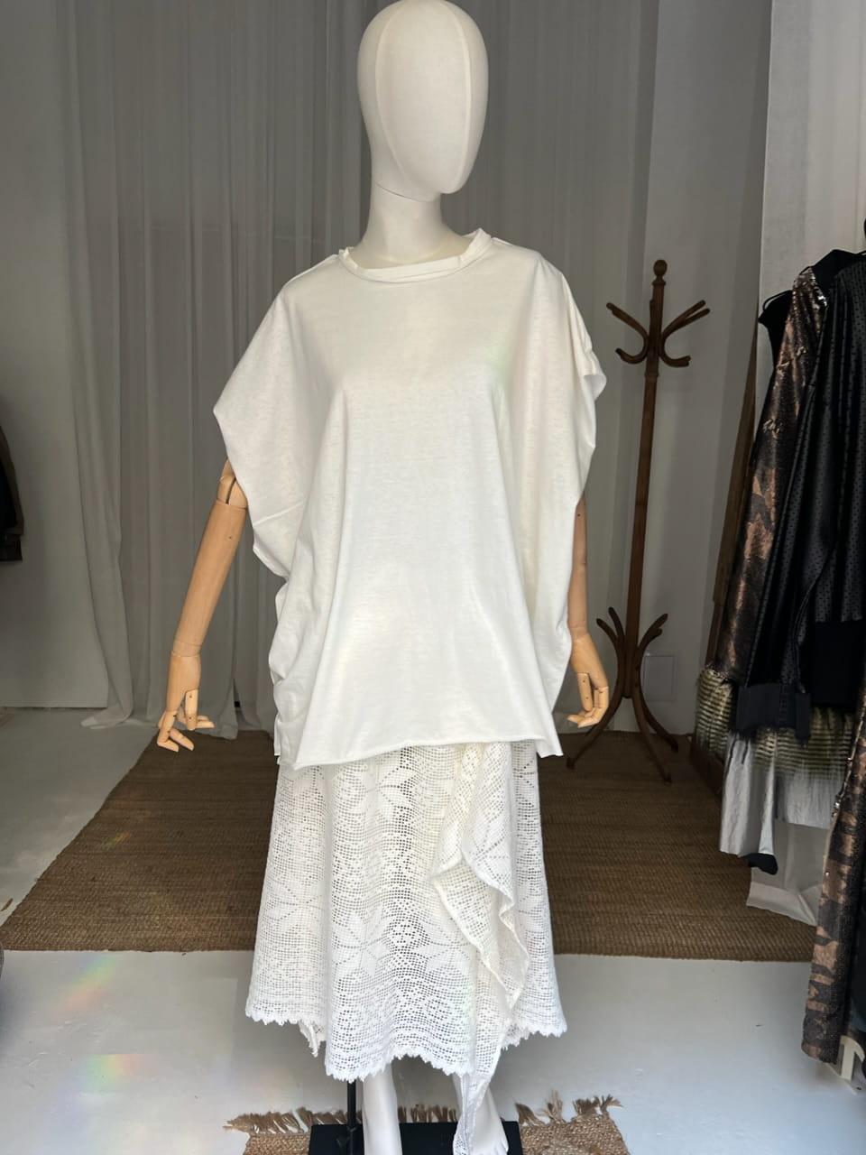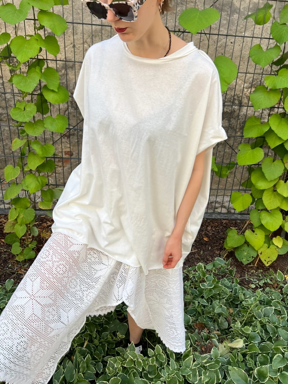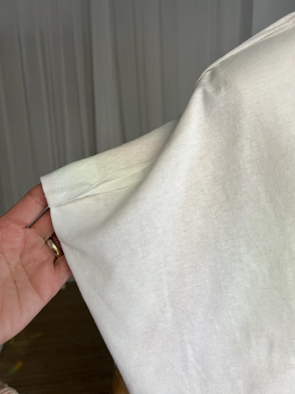 T-shirt Boxy z dzianiny kremowej, 150 gram, wyprodukowana w Łodzi. Prosta forma oversize z podwiniętymi ramionami.