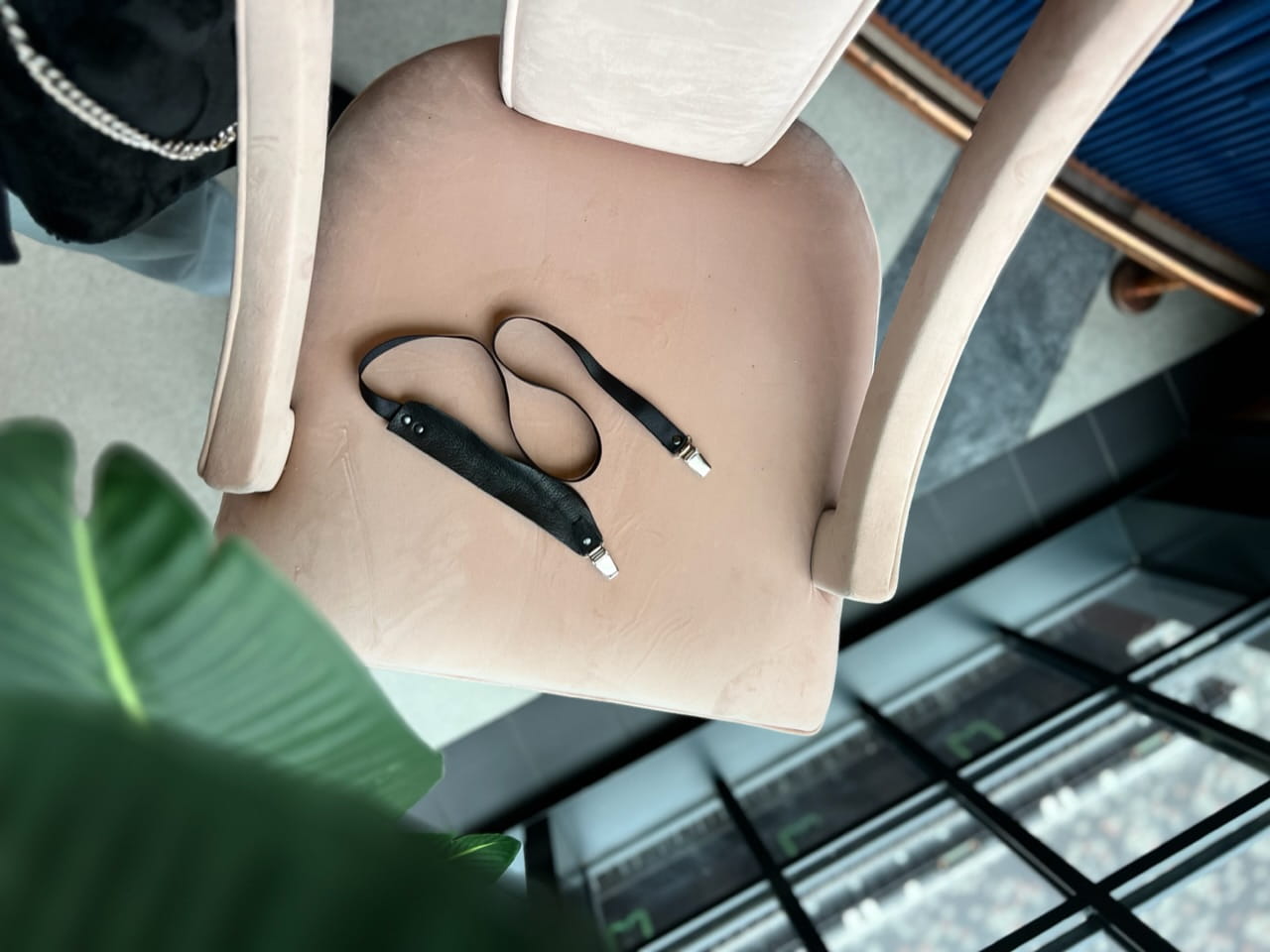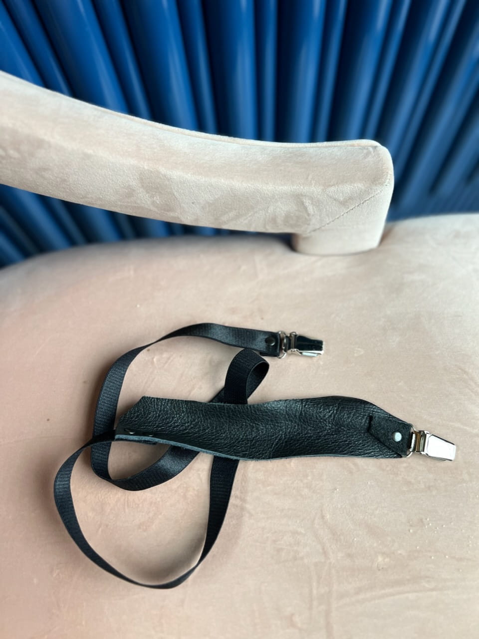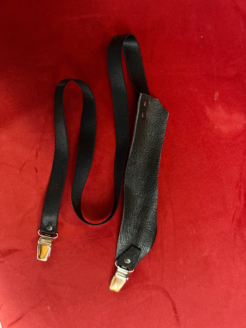 Skórzana zapinka/ żabki. Mocowana czarnymi nitami, żabki srebrne. Czarna skóra z odzysku, z motocyklowych kurtek, połączona z czarną, mięsista gumą. Idealna do przepięcia jako pas lub jako ozdoba swetrów, marynar czy sukienek.